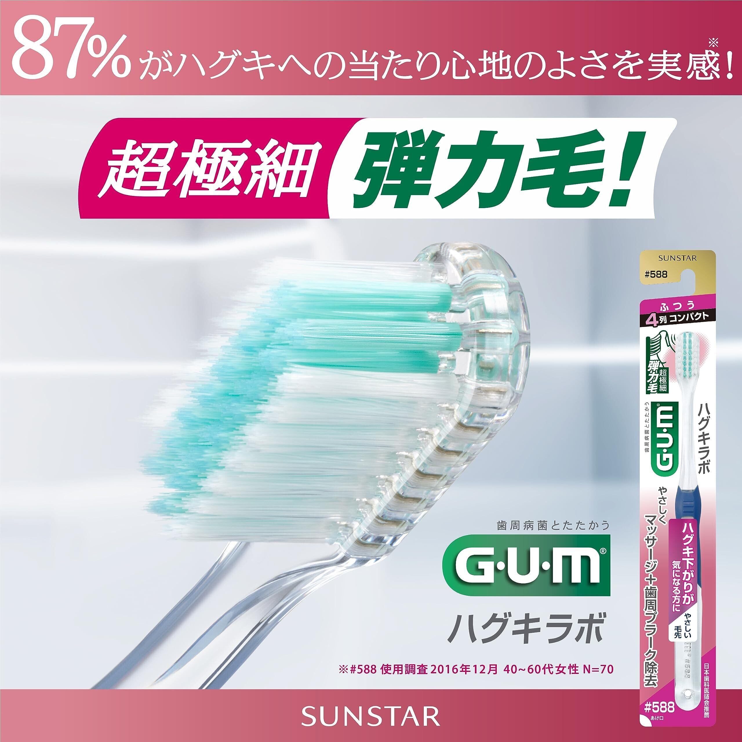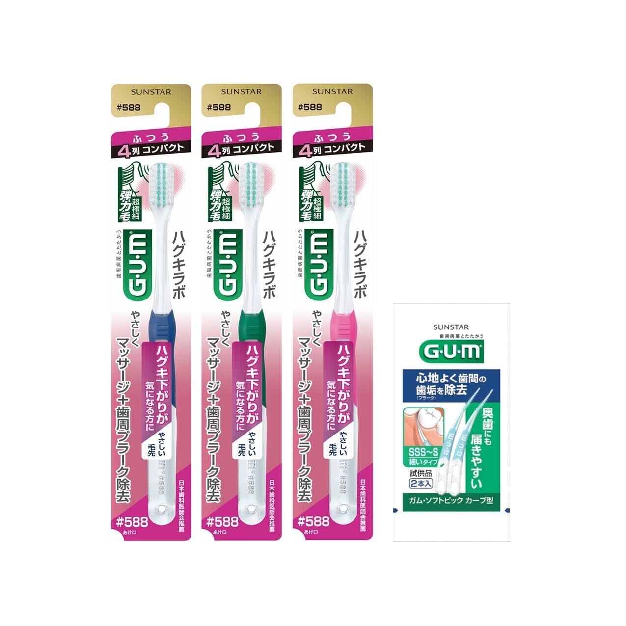 GUM(ガム) ハグキラボ デンタル 歯ブラシ #588 ハグキにやさしい毛先 歯周プロケア 4列 コンパクトヘッド ふつう ハグキケア毛 ( 極細毛先 ) 3本パック+おまけ付き まとめ買い ※色は選べません【品】