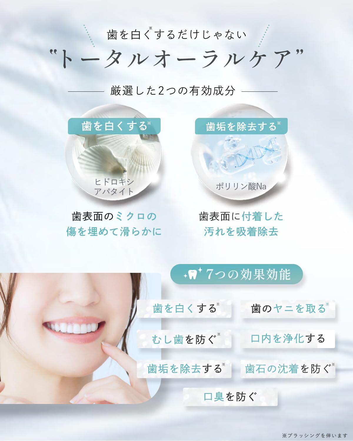 ヒドロキシアパタイト配合のホワイトニング歯磨き粉です。歯を削ることなく、本来の歯の白さを取り戻し、明るく清潔な印象に!