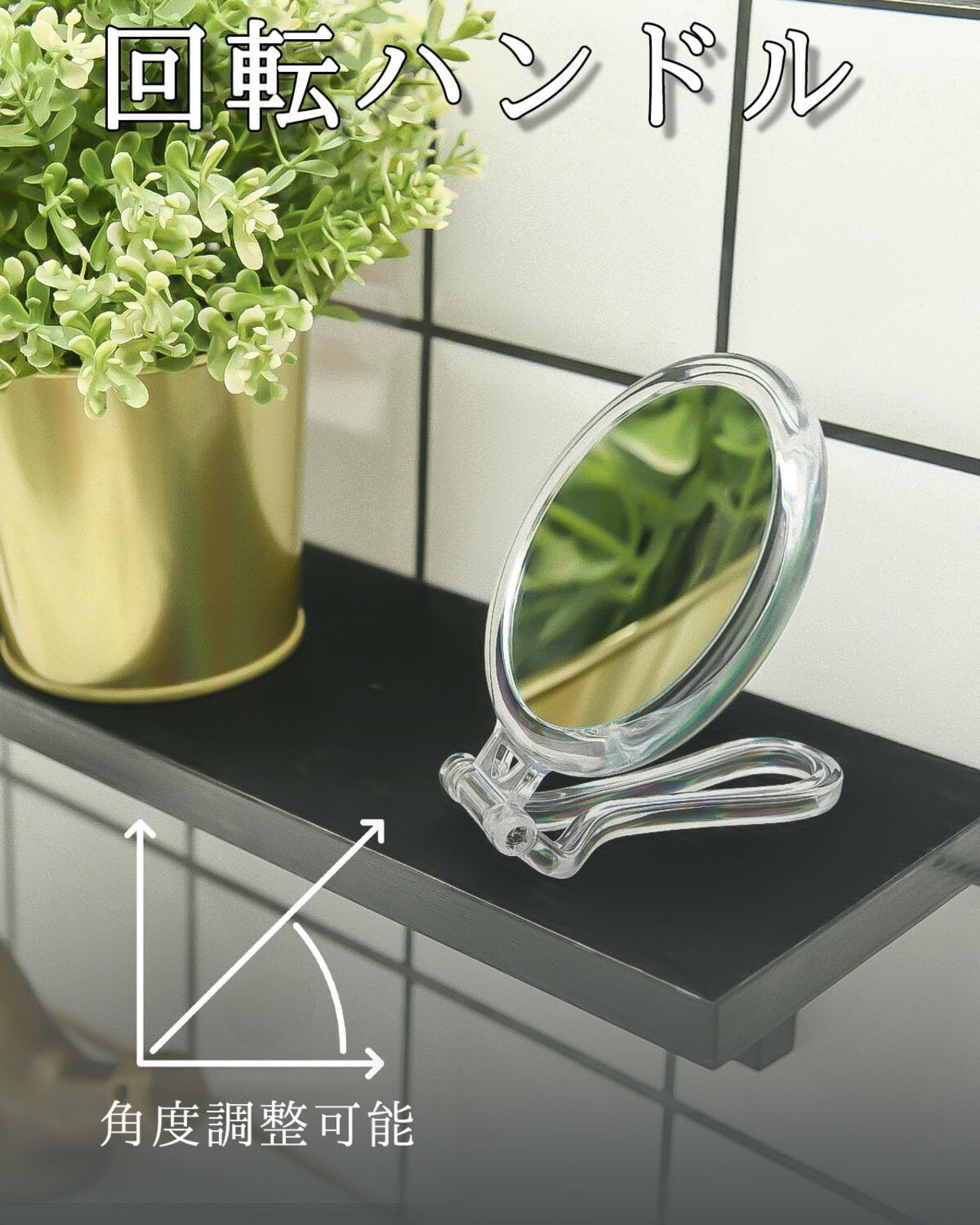 【折り畳み式ハンドミラー】持ちやすいハンドルが付いているため、ハンドミラーとしての使用が快適です。また、ハンドルは折り畳み式のデザインを採用しており、手鏡を卓上ミラーとしても活用でき、テーブルや洗面台に置いても便利に使えます。さらに、手鏡を片手で持つ必要がなくなり、両手を自由に使えるようになります。