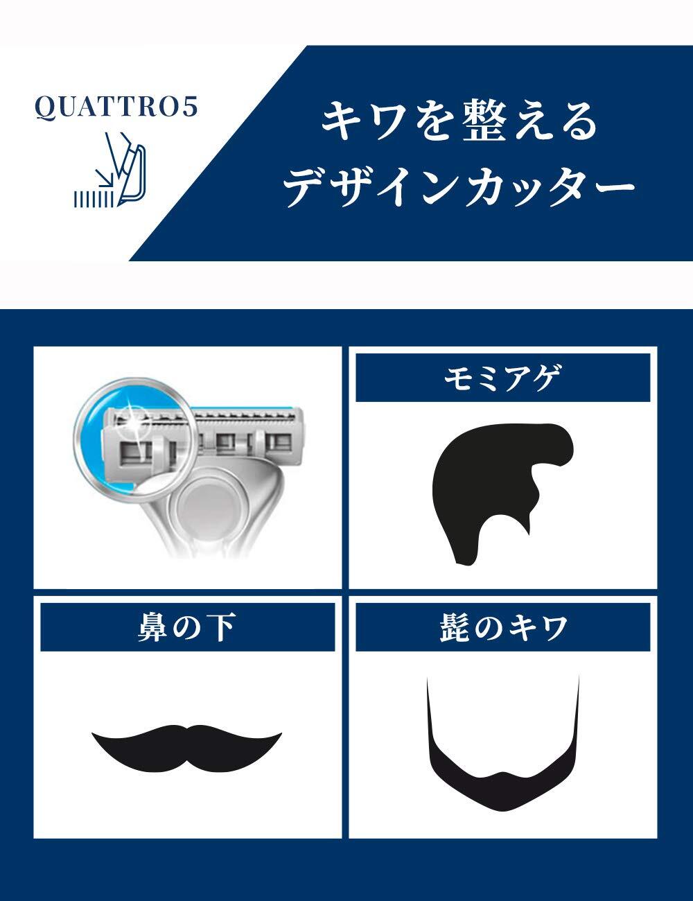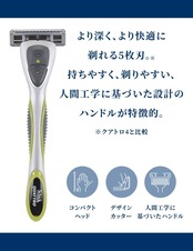 【シック ドイツ ゾーリンゲン製替刃の5枚刃カミソリ】より深く、より快適に剃れるチタンコート5枚刃 *クアトロ4と比較 ●チタンコート5枚刃:刃と刃の間隔を狭めることで肌への食い込みを防ぎ、安全にシェービングできます。●コンパクトヘッド:刃と刃の間隔を狭めた設計の替刃を採用しました。この設計により、5枚刃ながら4枚刃と同等のコンパクトなヘッドを実現。●キワを整えるデザインカッター付:肌をのばし、ヒゲを剃りやすい状態にする大型ガードバー付。●人間工学に基づいたハンドル :持ちやすく、剃りやすい、人間工学に基づいた設計のハンドルです。●ホホバオイル・アロエ・ビタミンE配合 スムーザー:刃のすべりを滑らかにし、剃り心地を快適にする。●大型ガードバー:肌を伸ばし、ヒゲを剃りやすい状態にする。