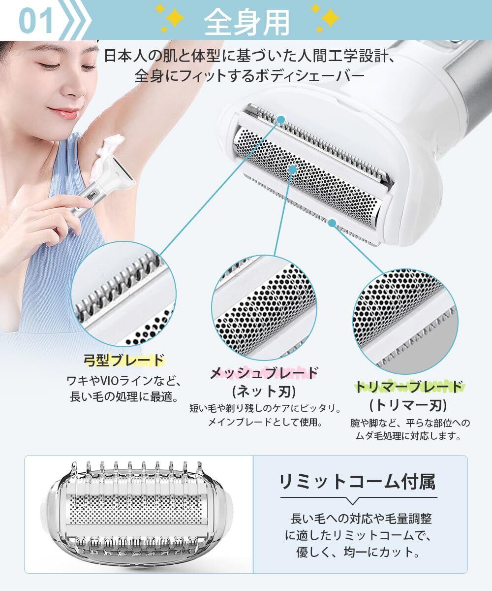 【肌に優しい・滑らかな剃りごこち】日本人の肌と体型に基づいた人間工学設計された 電気シェーバー 女性用 で、弓型ブレード、メッシュブレード、トリマーブレードなど、各部位のケアに最適なブレードを搭載。さらにリミットコーム付属で、肌に優しく、滑らかにケアします。敏感な部分も安心してお手入れできる vio シェーバー です。