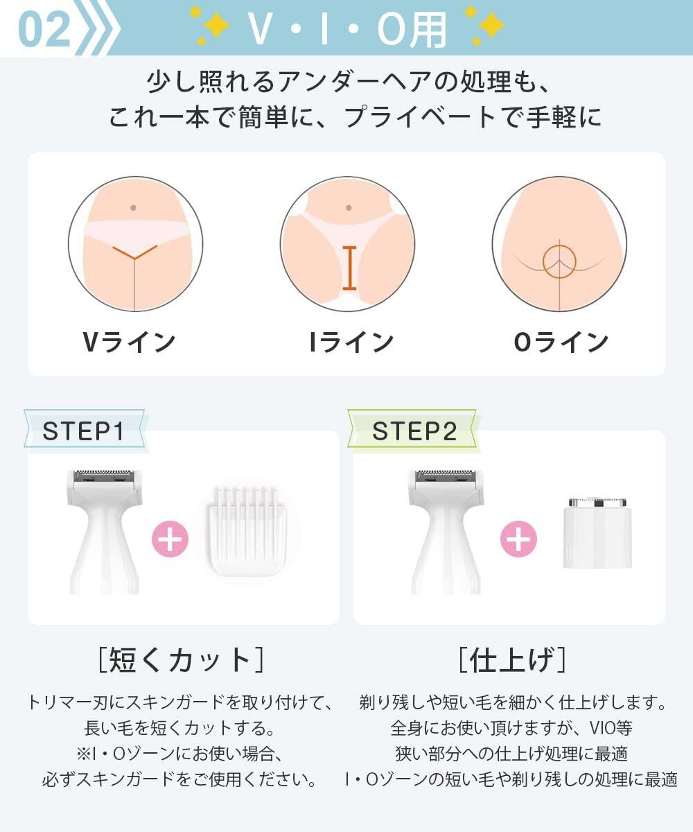 【プライベートケア・VIOのケア】少し照れるアンダーヘアの処理も、この vio カミソリで簡単に。Vライン、Iライン、Oラインのケアも、自宅で手軽にプライベートケア。気になる部分を、きれいに、そしてプライベートにケアできます。 【女性のためのデザイン】軽量かつコンパクトなデザインで、持ち運びにも便利。デリケートゾーンやビキニラインのムダ毛処理も安心してこのシェイバーで行えます。さらに、日本語説明書付きなので、初めての方も安心してご使用いただけます。