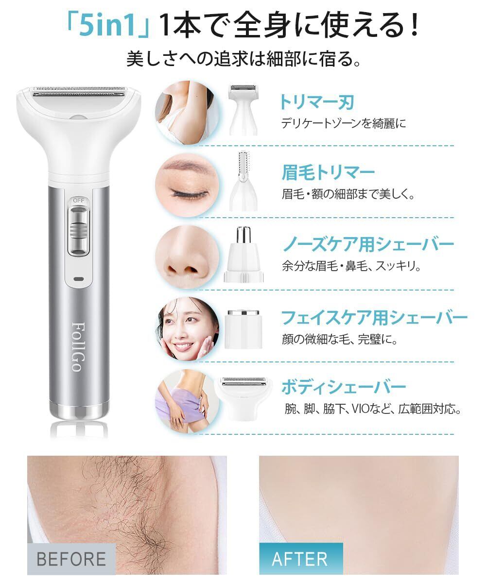 【究極の多機能性・5in1】美しい自分を追求するあなたへ。レディースシェーバー が全身のケアを手助けします。1台5役のこの マルチボディシェーバー は、VIO・顔・全身用に使え、眉毛トリマーやノーズケア、さらにはボディケアまで、あらゆるニーズに応えます。毎日のケアがこれ1台で完了。美しさへの追求は細部に宿る。