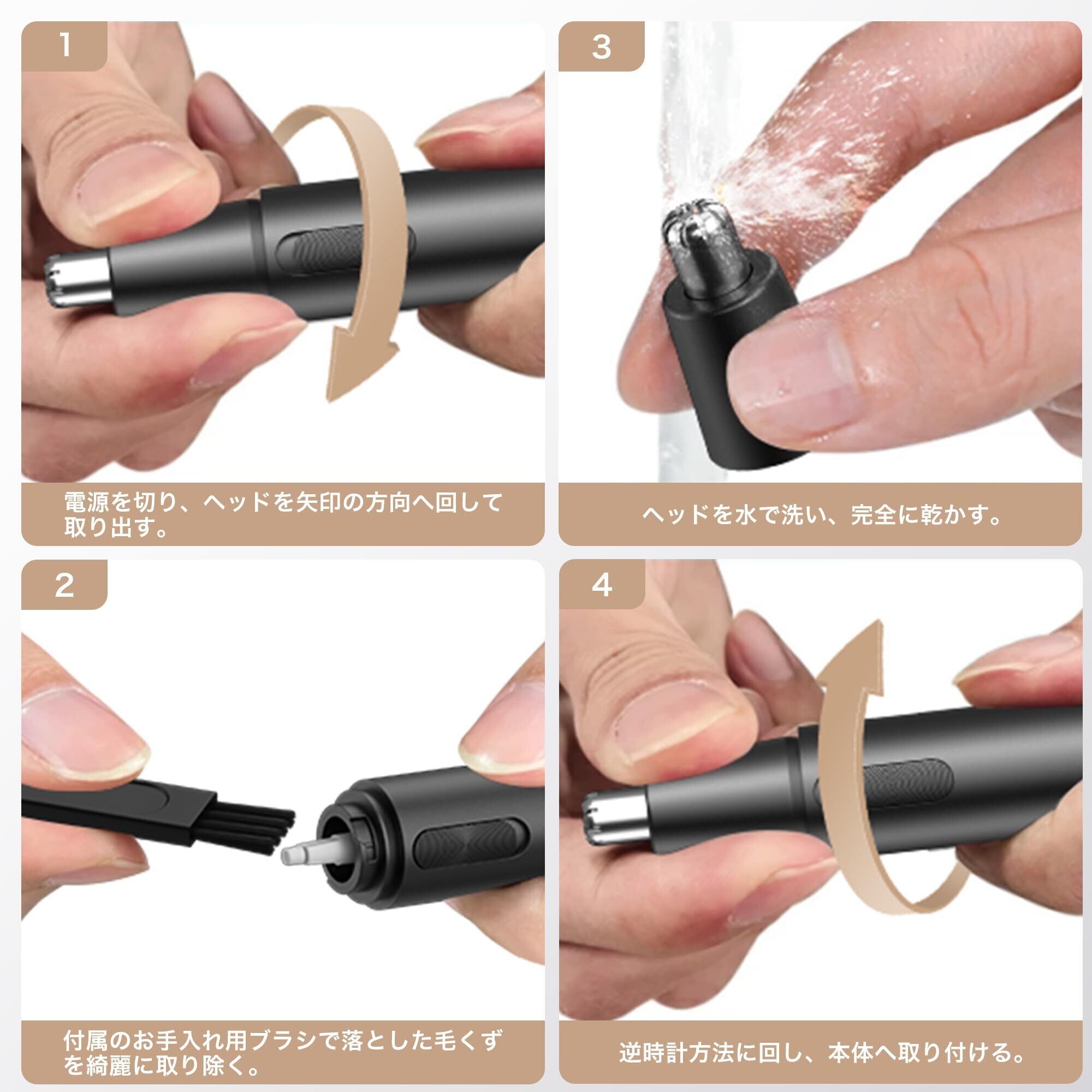 【お手入れが簡単】電動鼻毛カッターは、鼻毛切りの先端が外して水で洗うことができ、残留物や細菌の繁殖を防ぎ、いつでも清潔に保つことができます。注意:洗浄後すぐに水の汚れを拭き取り、鼻毛カッター本体を水に浸さないでください。