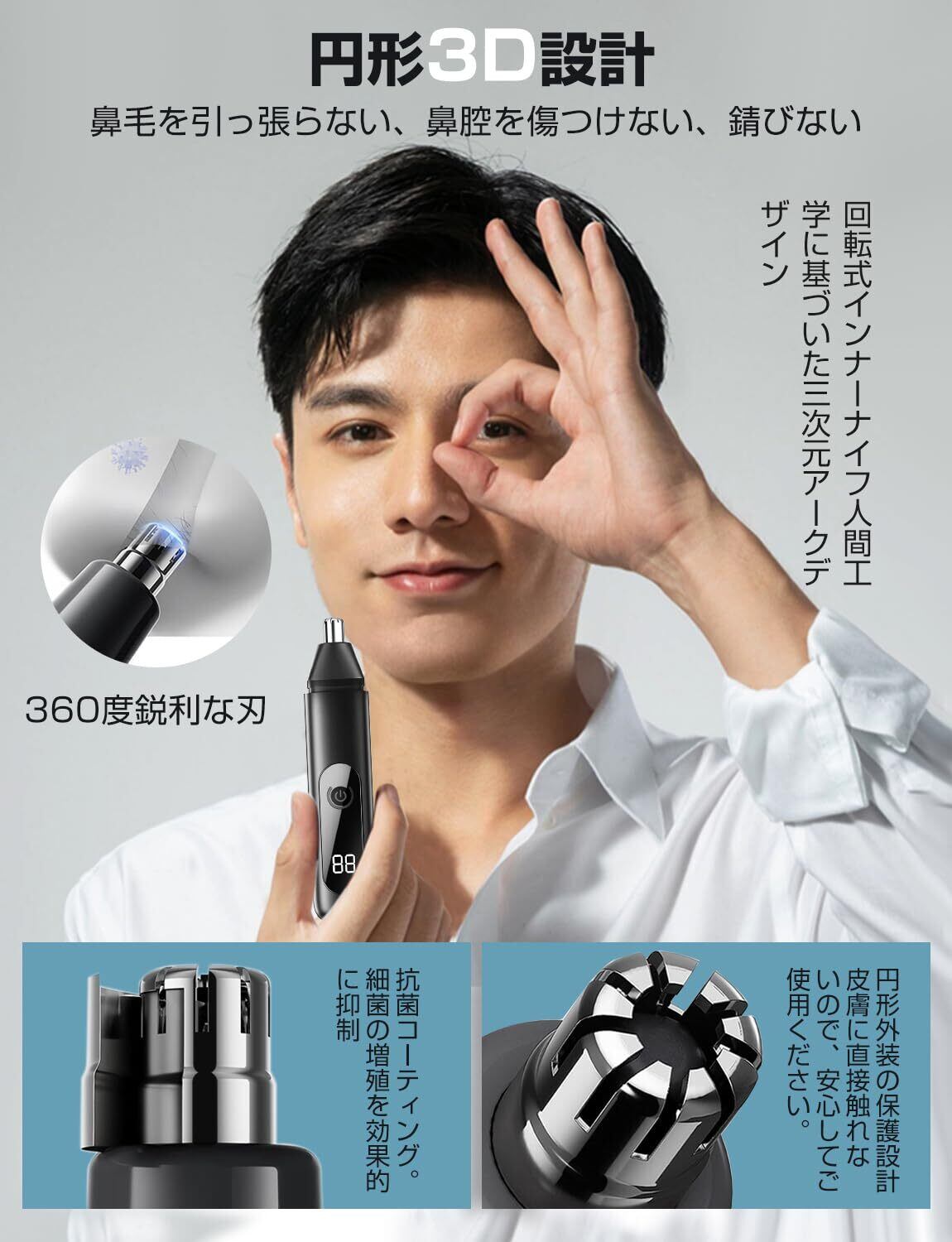 【丸い3Dデザイン&安全】この電動鼻毛トリマーの刃は人間工学に基づいた3Dデザインで、3D丸い保護キャップが付き、360度スリットから入る鼻毛を刃がキャッチできます。 鼻毛を引っ張ったり、鼻の中を傷つけたりすることなく、鼻毛トリマーがぴったりフィットするので、より安全で快適に使用できます。 また、水洗いできるので、使用後のお手入れもとても簡単。 刃と本体を流水で洗うだけで、常に清潔で安全に長期間使用できます。 清潔さを気にされる方、簡単なお手入れをお望みの方に最適な製品です。