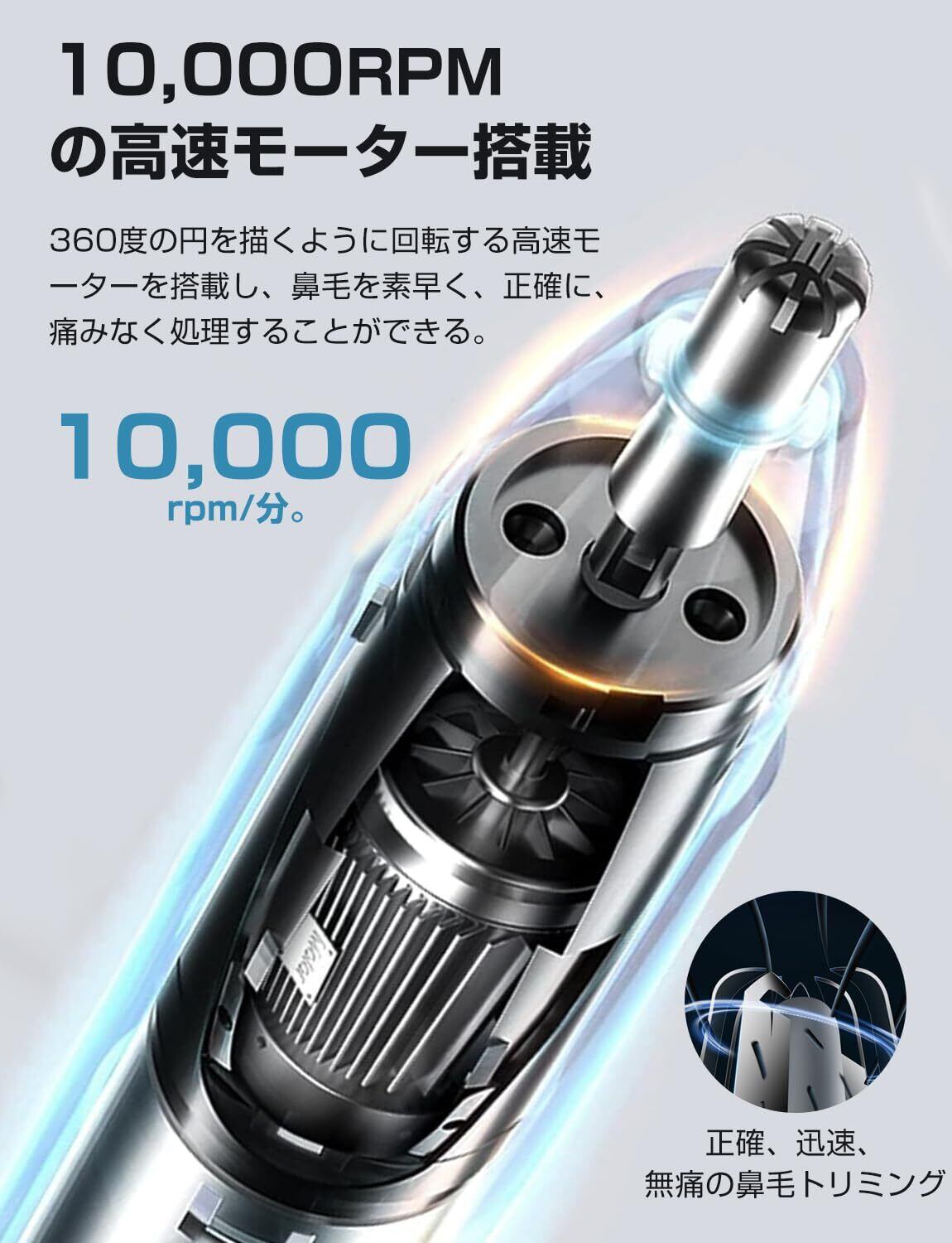 【肌に優しいケア鼻毛】鼻毛トリマーは、高品質の精密ステンレス刃とプレミアム構造で作られており、内蔵のダブルエッジ360°回転システムは、痛みや不快な引っ張りのない滑らかなシェービングを提供します。 10,000RPMの高速タコモーターを搭載し、鼻腔に快適かつスムーズに接触し、鼻毛の毛先を自動的にキャッチし、シャープで耐久性があり、清潔で新鮮です。電池残量が少なくなっても、電動鼻毛トリマーは着実にパワーレベルを下げ、毛抜きによる痛みや怪我を防ぎます。