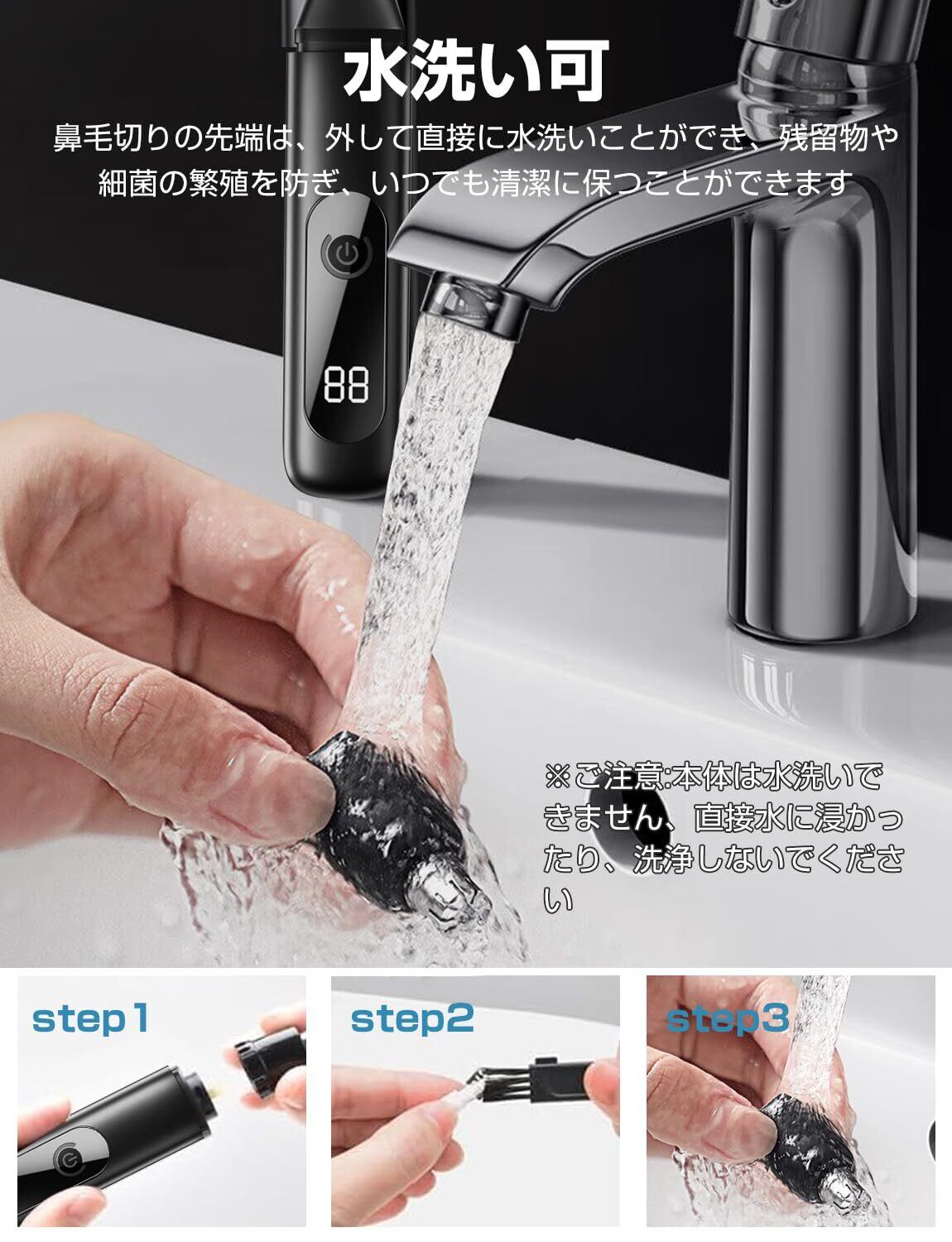 【IPX7防水&簡単お手入れ】電動鼻毛バリカンはIPX7防水なので、安心してお手入れできます(底面の充電口を除く)。 鼻毛バリカンの先端は回転、取り外し、そのまま水洗いできるので、残留物や細菌の繁殖を防ぎ、いつも清潔に保てます(本体は水で洗浄可能、洗浄後すぐに水垢を拭いてください、水に浸けないでください)。 付属のUSBケーブルで簡単に充電できます。 いつでもどこでも簡単に充電できます。 静かで効率的、耐久性に優れ、自宅でも旅行先でも使用できます。