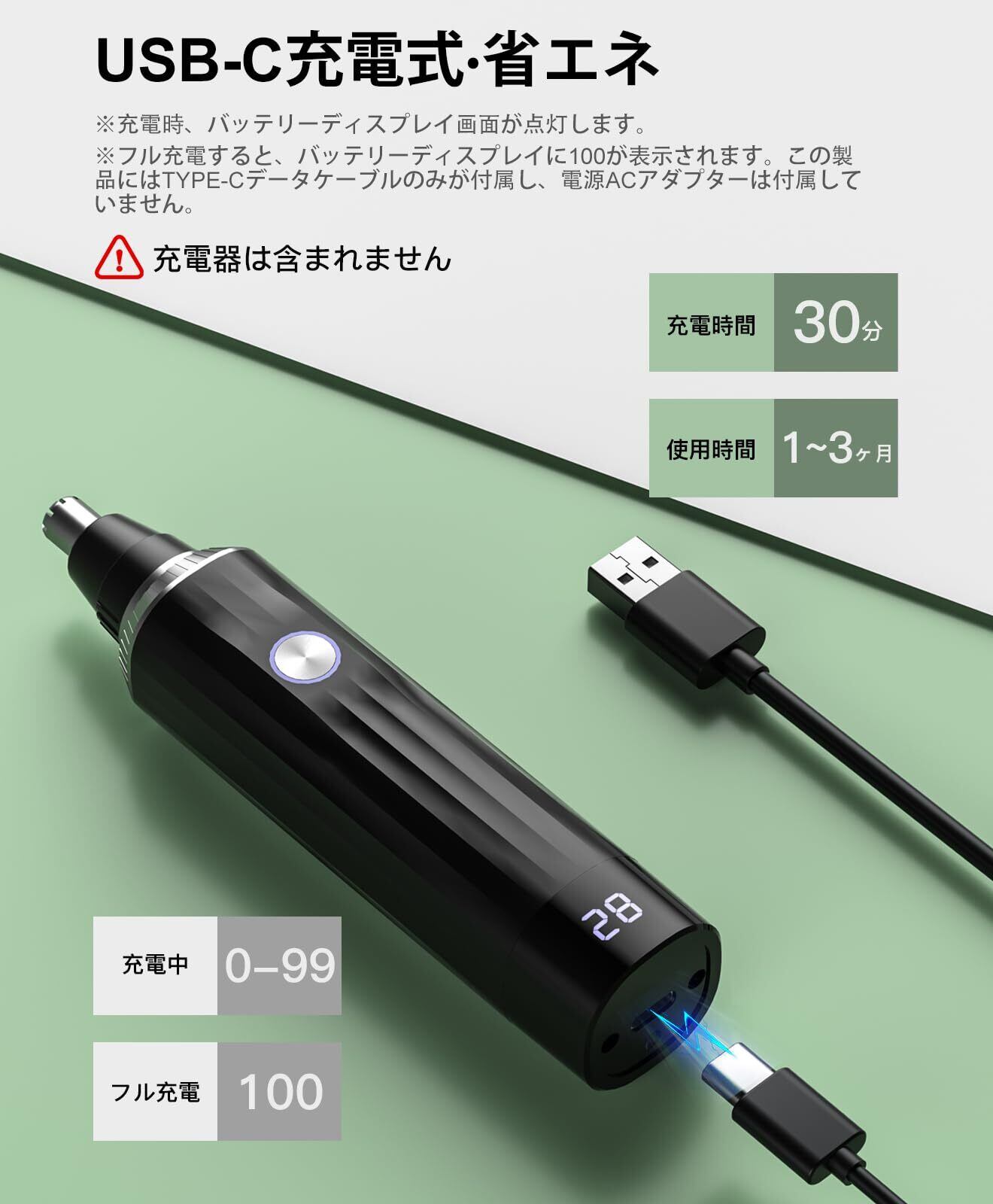 【LCD画面・Type-C急速充電・驚きの使用時間】デジタルLCDスクリーンを搭載したので、いつでも電力残量を把握することができ、途中で停電する心配がなく、使用体験をアップします。USB充電ポートの独自の設計を使い、過電圧、過充電、短絡を防止し、安全性を向上させる同時に、充電速度を大幅に向上し、満タン充電はわずか2時間です。鼻毛カッター パワフルでありながら消費電力が少なく、1度充電すれば最大3ヶ月間の鼻毛切りが行えるため、出張や旅行の移動用としてバッテリー持ちが良く長時間使えます。ご注意ください:充電器は含まれません。