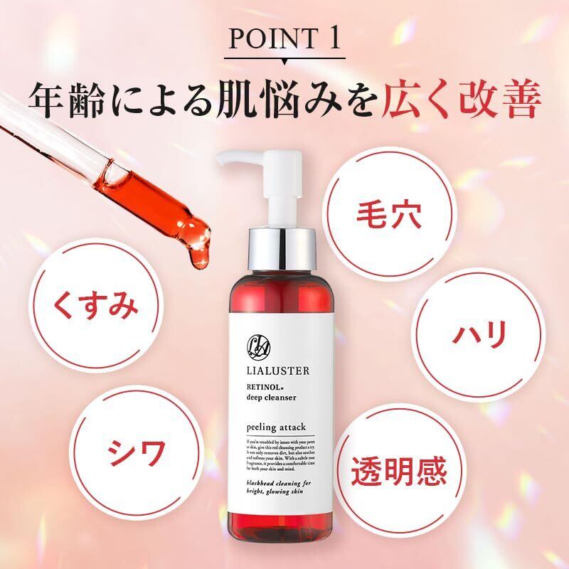 ✨シリーズ累計150万個突破!メイクを落とすたびにつるんとした新しい肌になれるレチノール*ディープクレンザー:安定型レチノール*、AHA(フルーツ酸)、BHA(サリチル酸)などの低刺激なピーリング成分で肌トラブルを除去するピーリングクレンズ。クリニック発想の洗浄技術で、メイクと一緒に毛穴汚れやくすみをオフし、クリアな潤い素肌に導きます。* パルミチン酸レチノール ●その他主な成分(一部):水、ヤシ油脂肪酸PEG-7グリセリル グリコール酸0.0007 w/w%