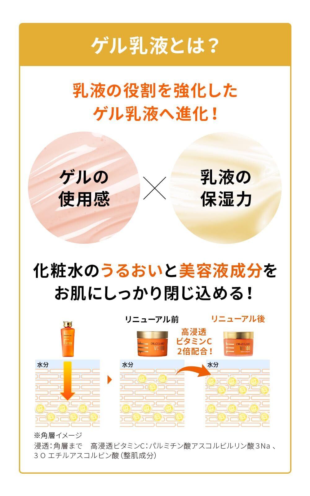 乳液の役割を強化した、ゲル乳液へ進化!化粧水のうるおいと美容液成分をお肌にしっかり閉じ込める! 【POINT1】高浸透ビタミンCを従来品の2倍配合!高浸透ビタミンC:パルミチン酸アスコルビルリン酸3Na 、3 O エチルアスコルビン酸(整肌成分)