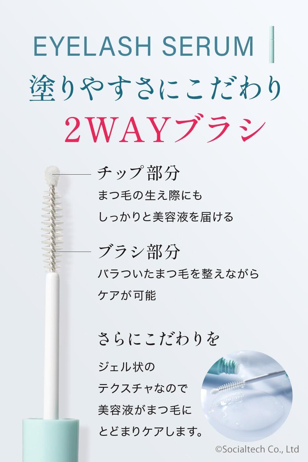 【こだわりの2WAY形状でストレスフリーな塗り心地】チップ+スクリューブラシの2WAY形状を採用し、細かい部分にも塗布できるストレスフリーな塗り心地を実現。根本から毛先の細かい部分まで満遍なくケアが可能で、短いまつ毛にもジェル状の美容液がしっかりと密着します。また、眉毛のケアにもお使いいただけます。