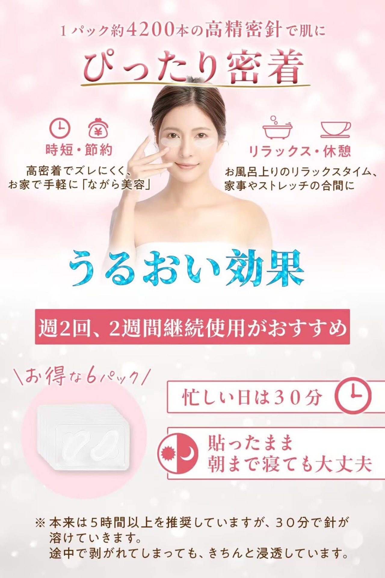 【日本企業企画・日本語サポート】使用にご不快があればお気軽にまでご連絡ください。ご連絡方法:ご購入履歴から製品画面を開く=>右側(カート)の下方に[販売元]後ろの会社名をクリックする=>新画面の右上に[質問する]ボタンをクリックする。●ご使用方法:1.就寝前の洗顔後に化粧水や乳液を使って肌を整えます。2.フィルムからパッチをはがして目元や口元お気になる部分に貼り付けます。3.パッチを貼ったまま就寝します(5時間以上お薦めます。時間が少ないと針状のヒアルロン酸が溶けない可能性があり)