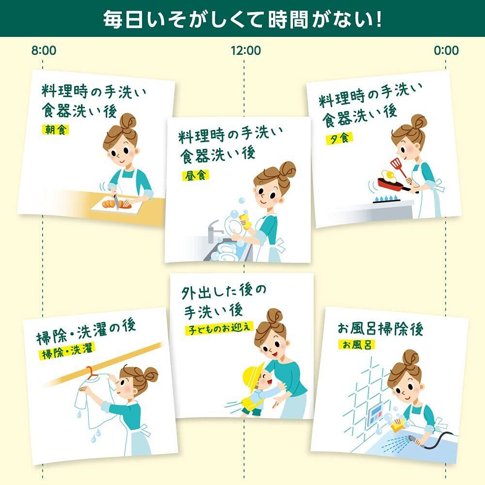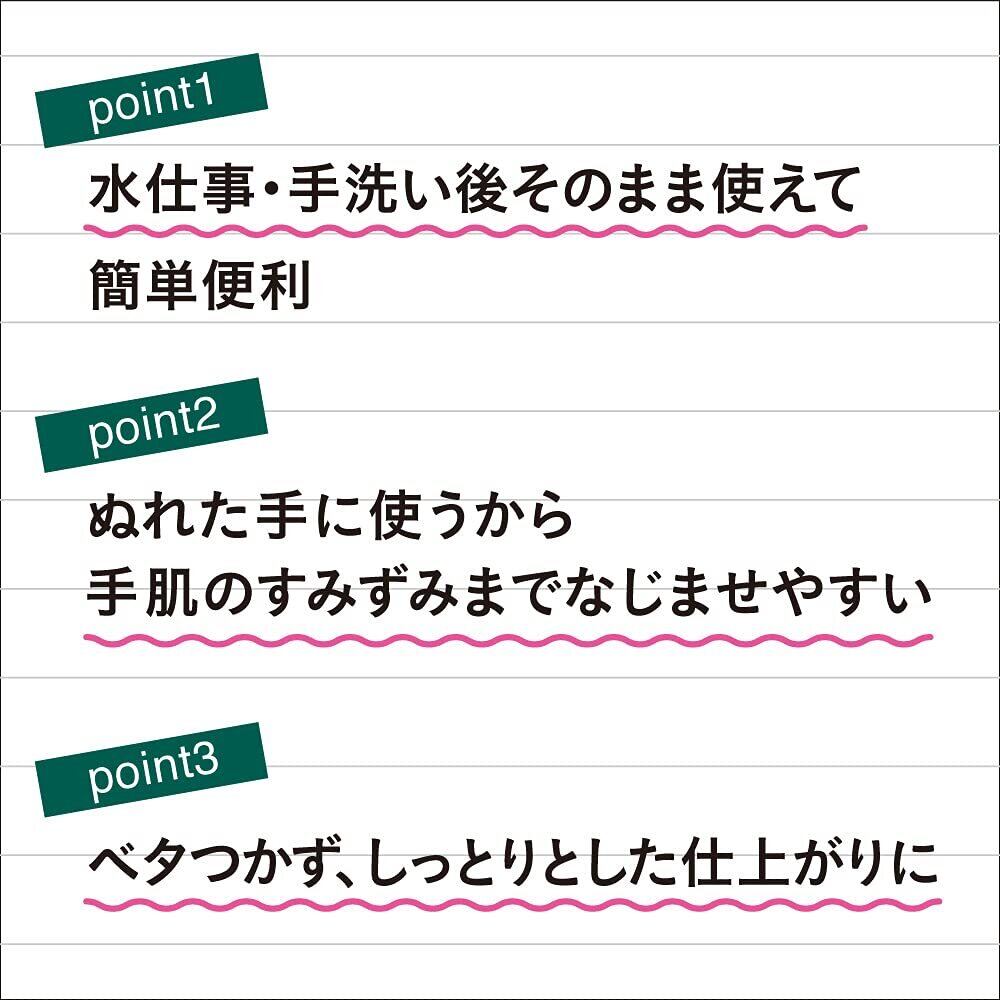 食器洗い後、手洗い後、ぬれた手に使ってサッと流す手軽なハンドケア習慣。ぬれたままの手にワンプッシュし、手肌になじませた後、水で流すとうるおいのベールが手肌のすみずみまで包み込み、ベタつかずしっとりとした仕上がりに。 ●うるおい成分:カモミールエキス(カミツレ花エキス)・ワセリン配合 ●無香料