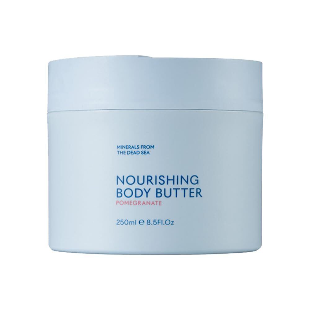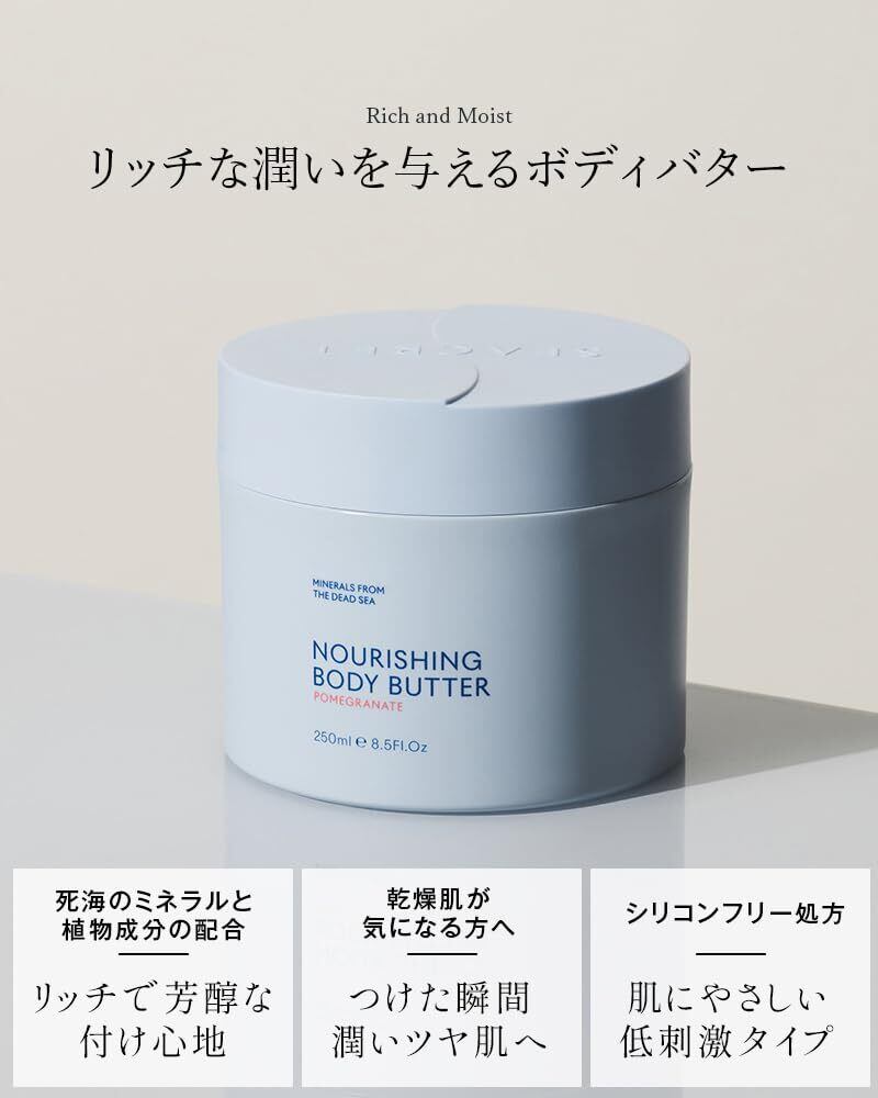 つけた瞬間、潤いツヤ肌へ:SEACRET ボディバターはシアバターにオリーブオイルと死海のミネラルを贅沢に加えたリッチな使用感ながら、肌なじみが良くご家族で安心してご使用頂ける処方です。乾燥肌や水分保持機能が低下した肌にも適しており、贅沢な使用感を感じます。心安らぐザクロの香りとともに、至福の時間をお楽しみください。