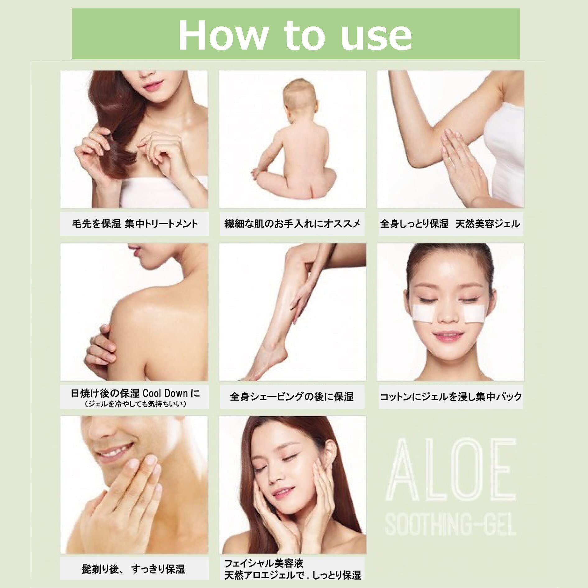 使用方法はさまざま! ●アフターシェーブ カミソリによりダメージを受けた肌へ適量を塗り伸ばし馴染ませます。 ●ヘアエッセンス ダメージのひどい毛先に塗ります。 ●アイパック コットンに冷蔵庫で冷やしたジェルを含ませ、目の上に乗せます。 ●日焼け後 ジェルを適量とり体に伸ばして塗ります。(冷やすのがおすすめ。)赤くなった肌を鎮静し保湿! ●全身美容液 素早くなじむ浸透力! みずみずしく潤い保湿。