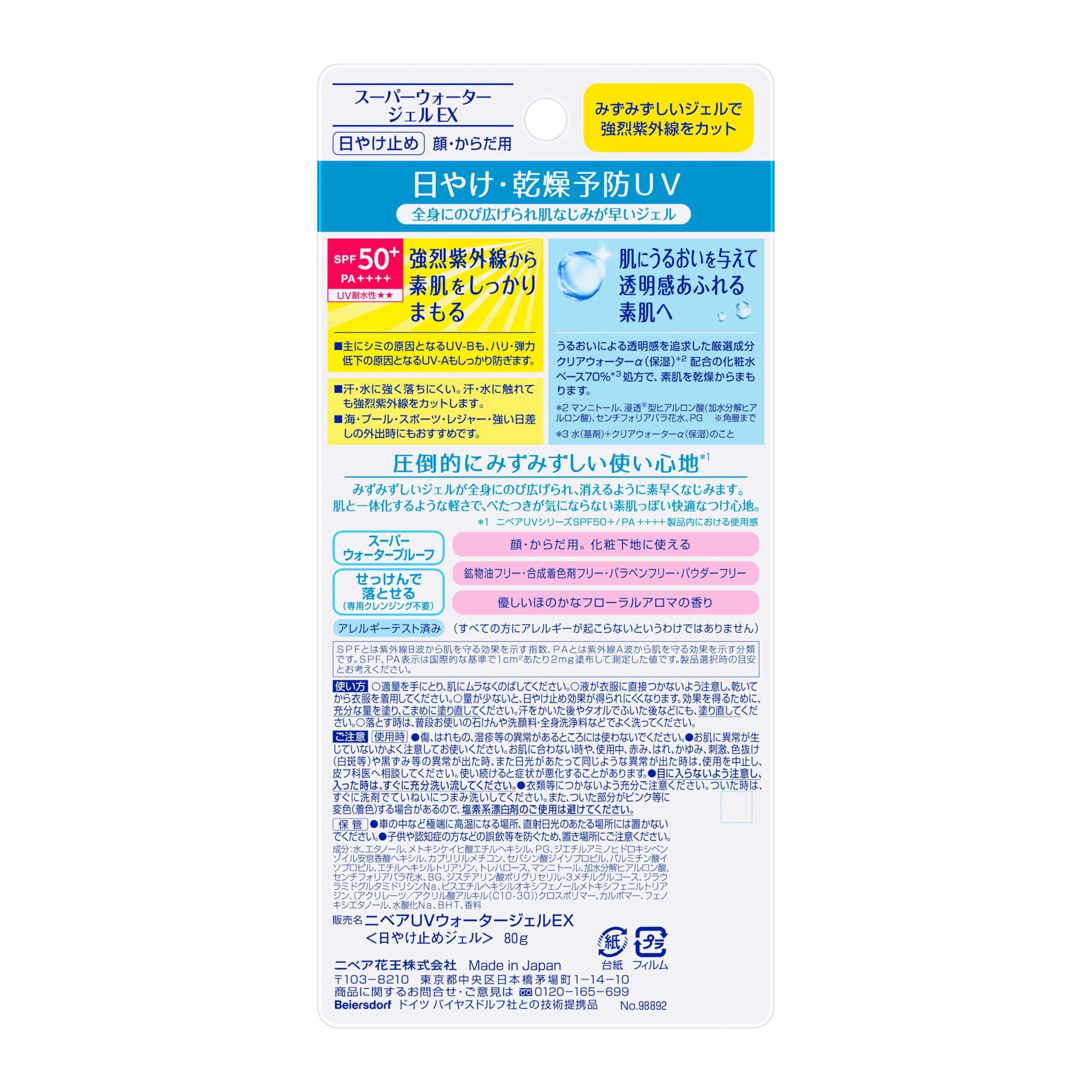 ◆日やけ・乾燥予防UV SPF50+/PA++++/UV耐水性 ◆圧倒的にみずみずしい使い心地*1。ジェルが全身にのび広げられ、消えるように素早くなじむ。肌と一体化するような軽さで、べたつきが気にならない素肌っぽい快適なつけ心地。◆顔・からだ用◆スーパーウォータープルーフ◆せっけんで落とせる *1ニベアUVシリーズSPF50+/PA++++製品内における使用感