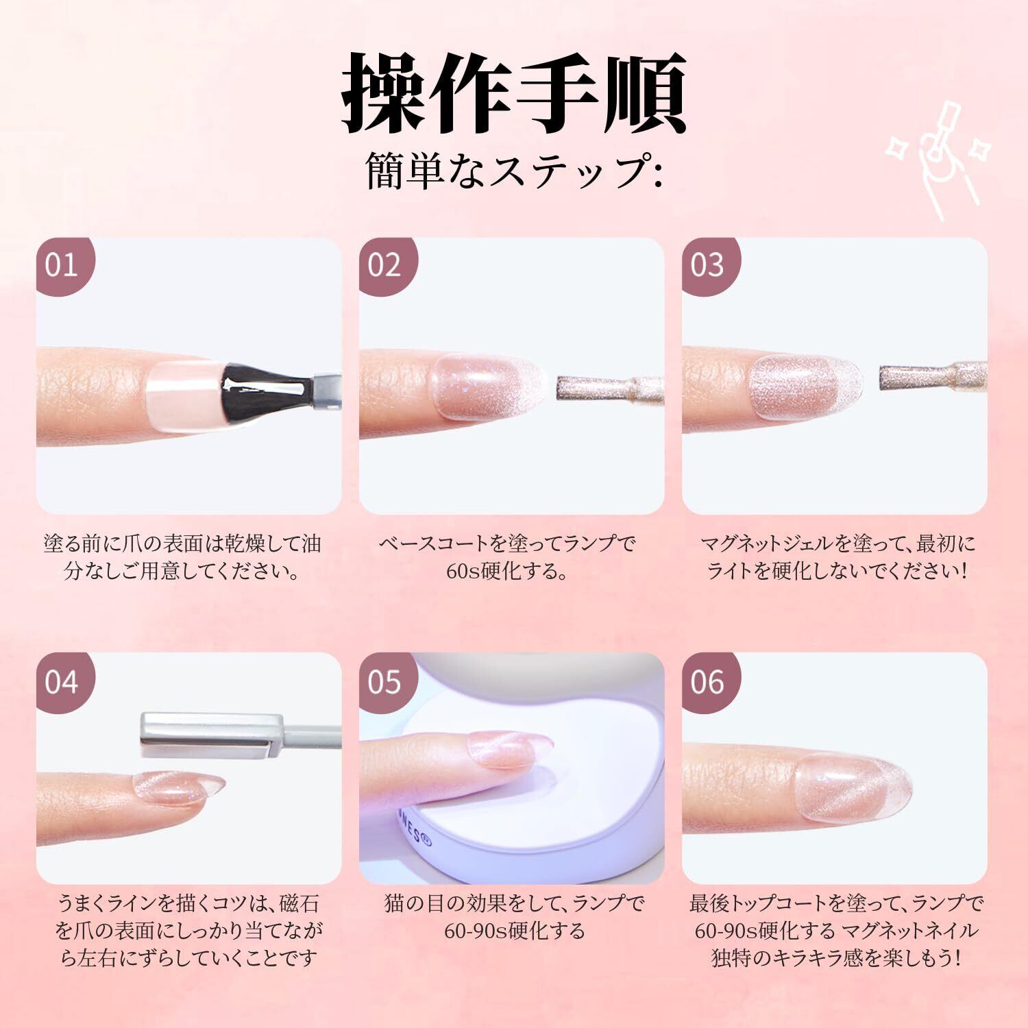 UV/LEDライト対応:UV/LEDライトで硬化必要です。 硬化時間目安:36W UVライト:約120秒 / 36W LEDライト:約60秒。ヒント:ご使用になるライトや塗布量によって多少の増減はあります。カラー見本と実際の色にはディスプレイなどにより異なって見える場合がございます。 予めご了承くださいませ