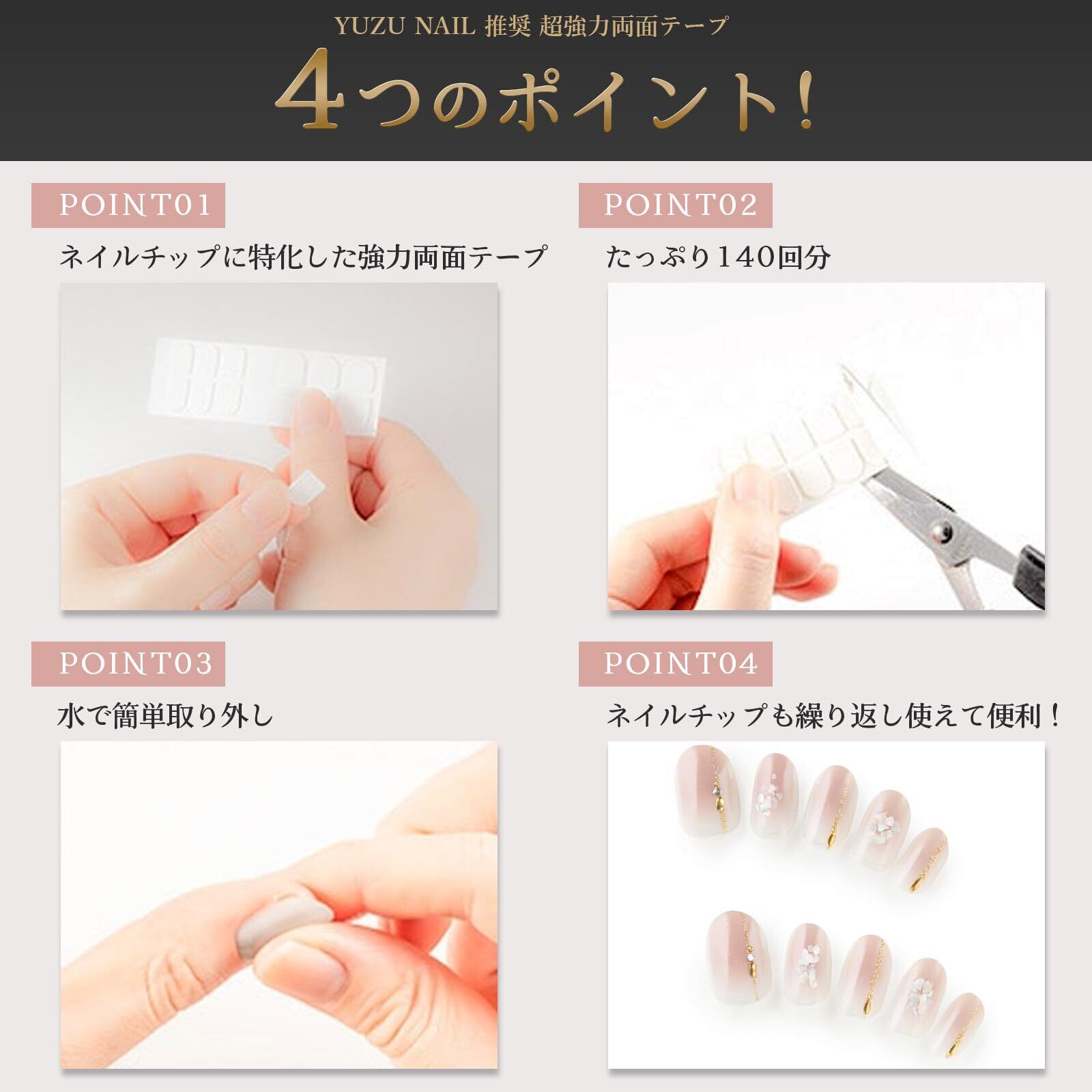 【ゆずネイル推奨 超強力両面テープ】 ●ゆずネイル オリジナルの強力両面テープです。 ●手早く脱着可能なのに、超強力です。 ●ネイルチップも繰り返し使えて、爪への負担がほとんどありません。 ●本商品1個で両手約14回分です。 【内容量】 10シート入り (1シート14枚) 使用上の注意 ・ご利用中は、できるだけ長時間水に触れないようご注意ください。 ・手を洗う際にウエットティッシュやお手拭などをご使用ください。 ・寒い所でのご使用は粘着力低下の可能性があります。 ・テープは常温より冷やさないでください。