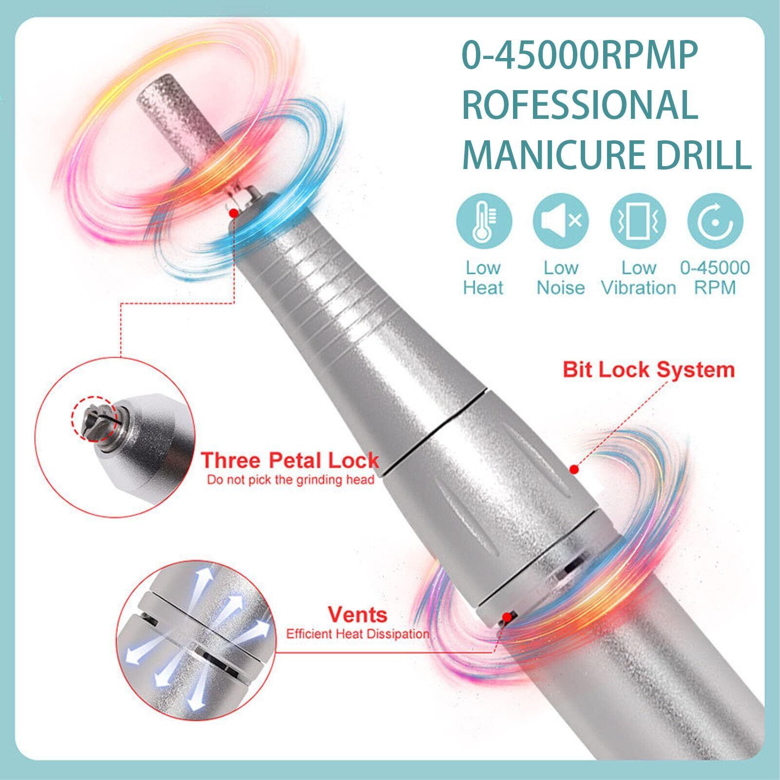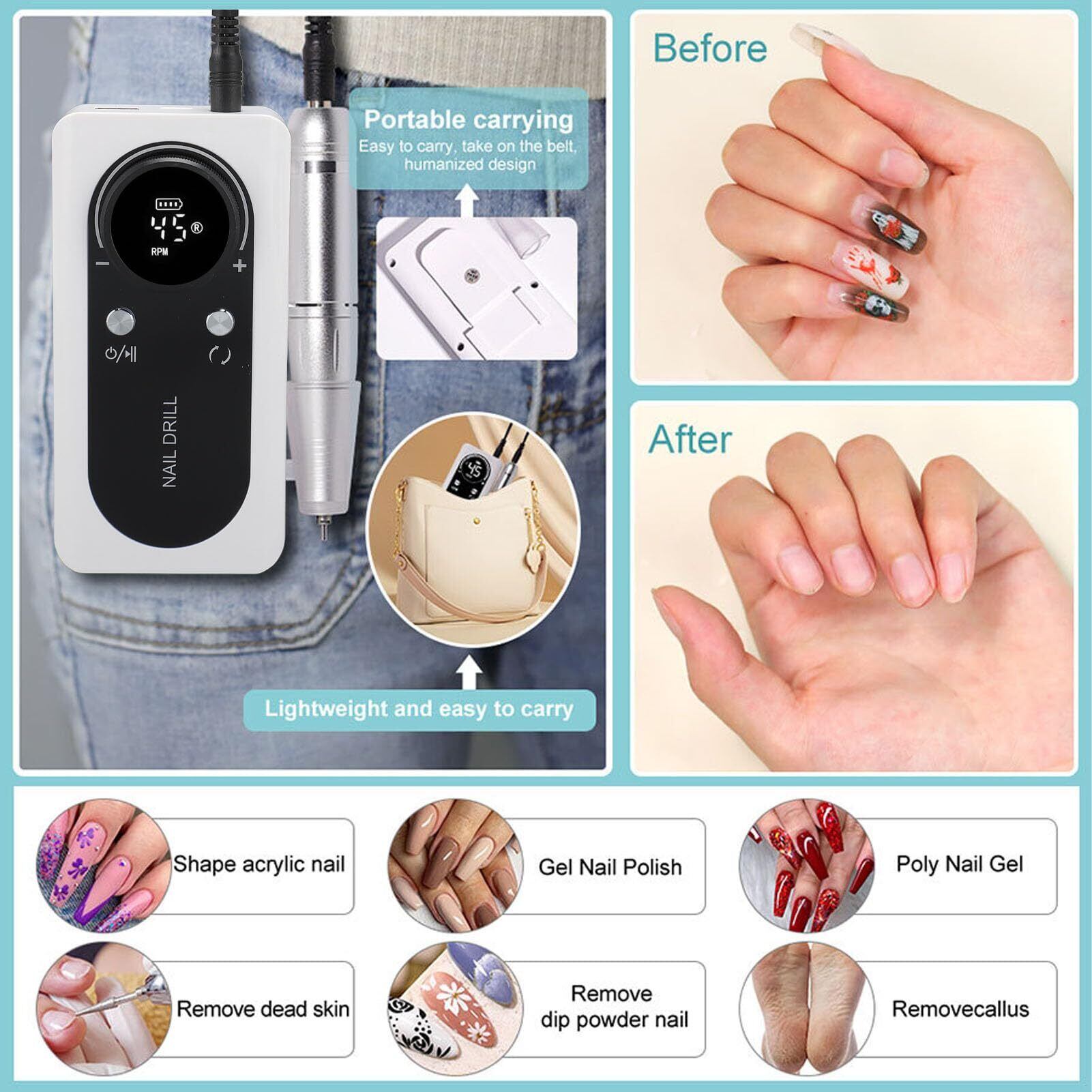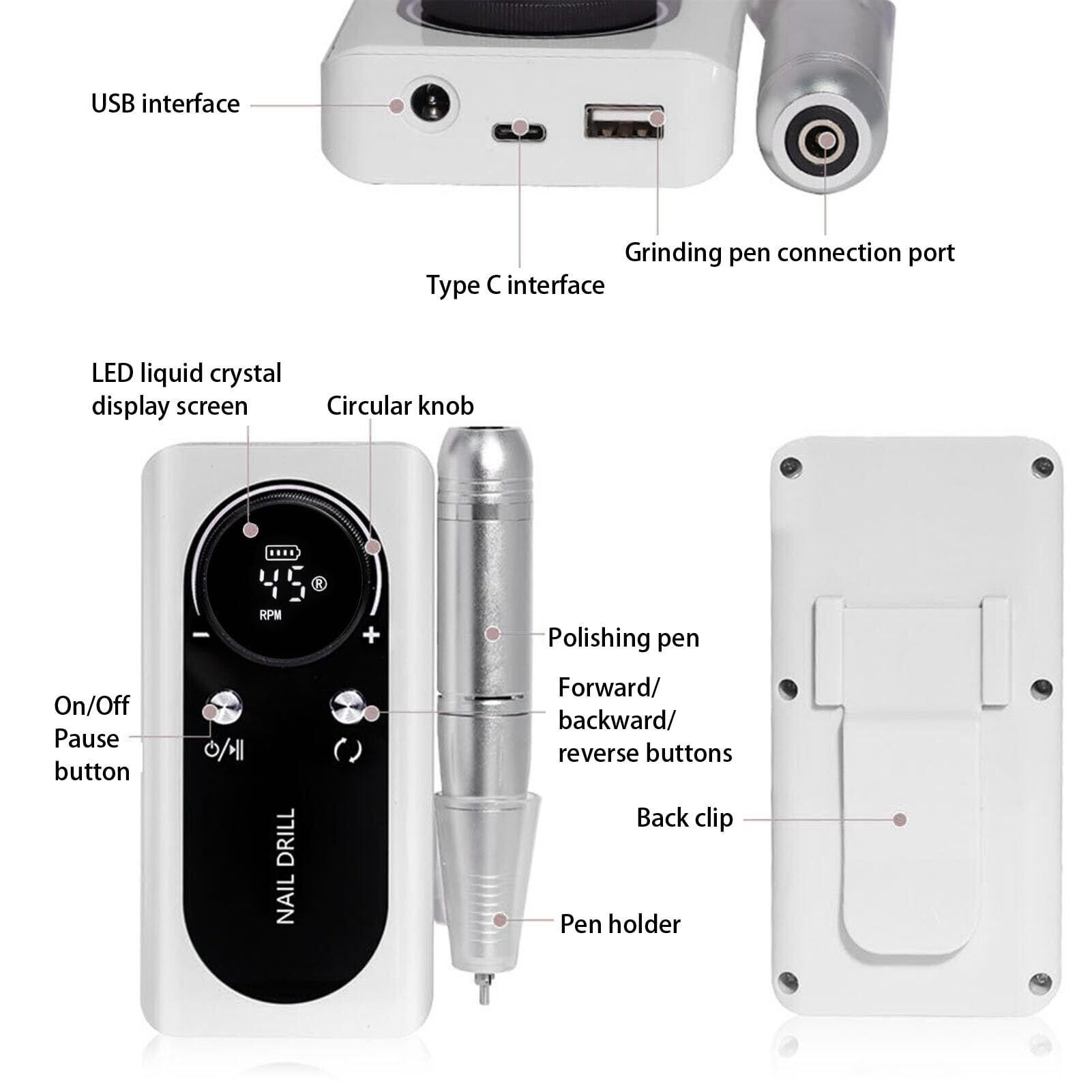 電動ネイルドリルマシン、45000 RPM USB充電式電子マニキュアペディキュアツール、さまざまな研削ヘッド付き、アクリルネイルドリルジェル研磨形状ツール用