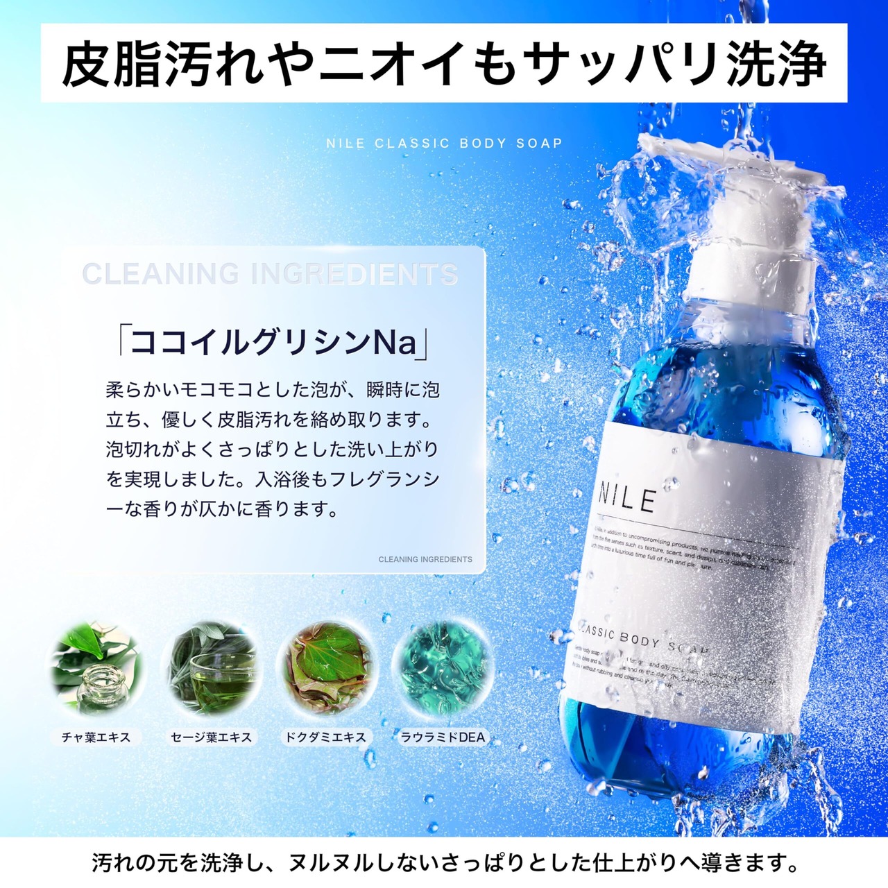 【におい・肌トラブルをカバー】ニオイケア成分、肌トラブルケア成分をそれぞれ5種類ずつ配合しボディクレンジング後のアフターケアも行います。