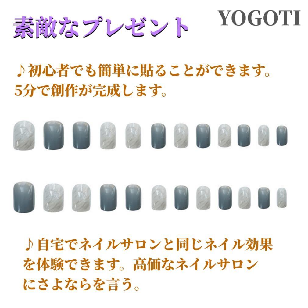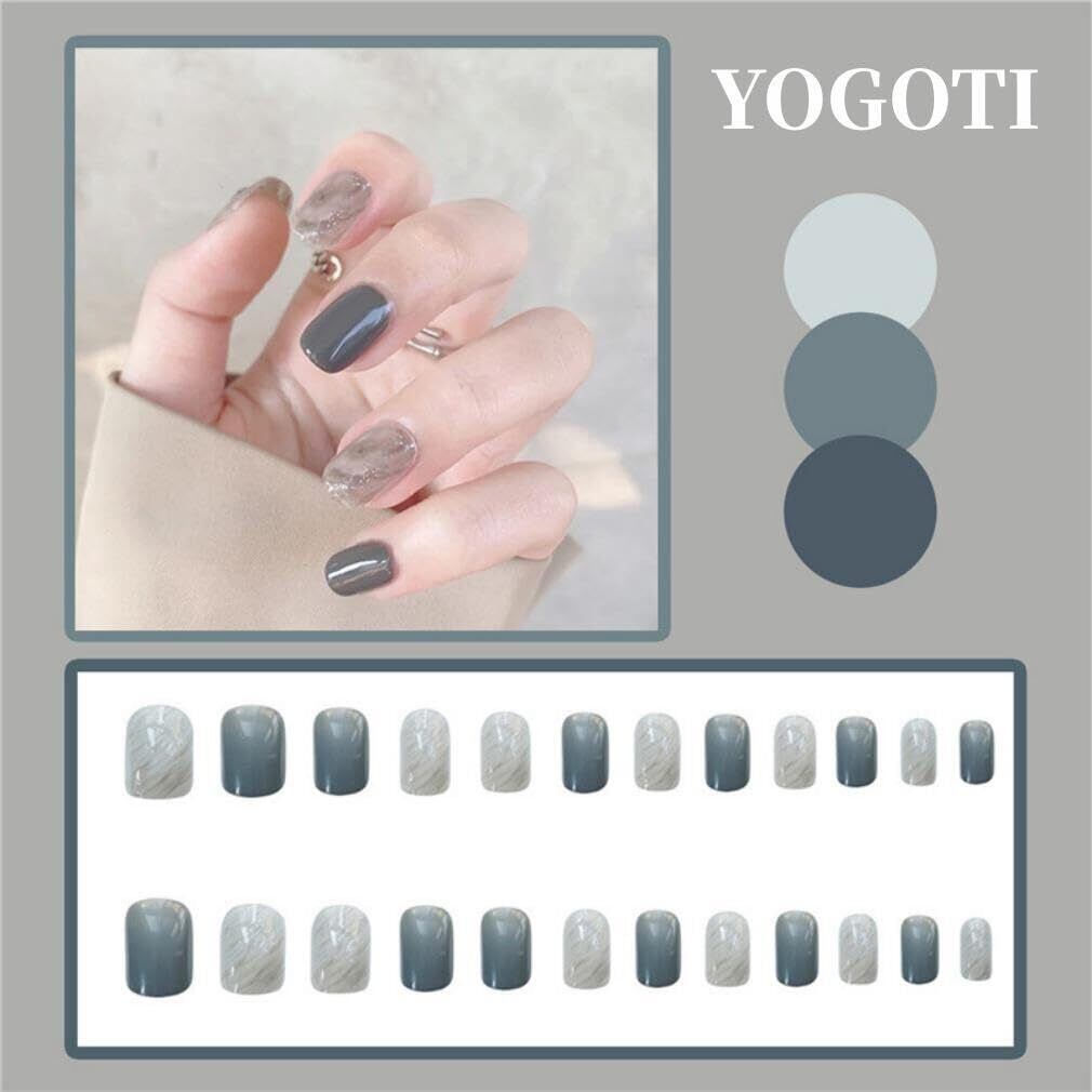 YOGOTI ネイルチップ 24枚入 ショート ジェルネイル ネイルシール つけ爪 ネイル 春夏ネイル 秋冬ネイル ラウンドチップ 人気 和風 かわいい キラキラ 卵形 短い 3D爪 ネイル用品 両面テープ ウッドスティック 爪やすり付き (ブルーグレー)