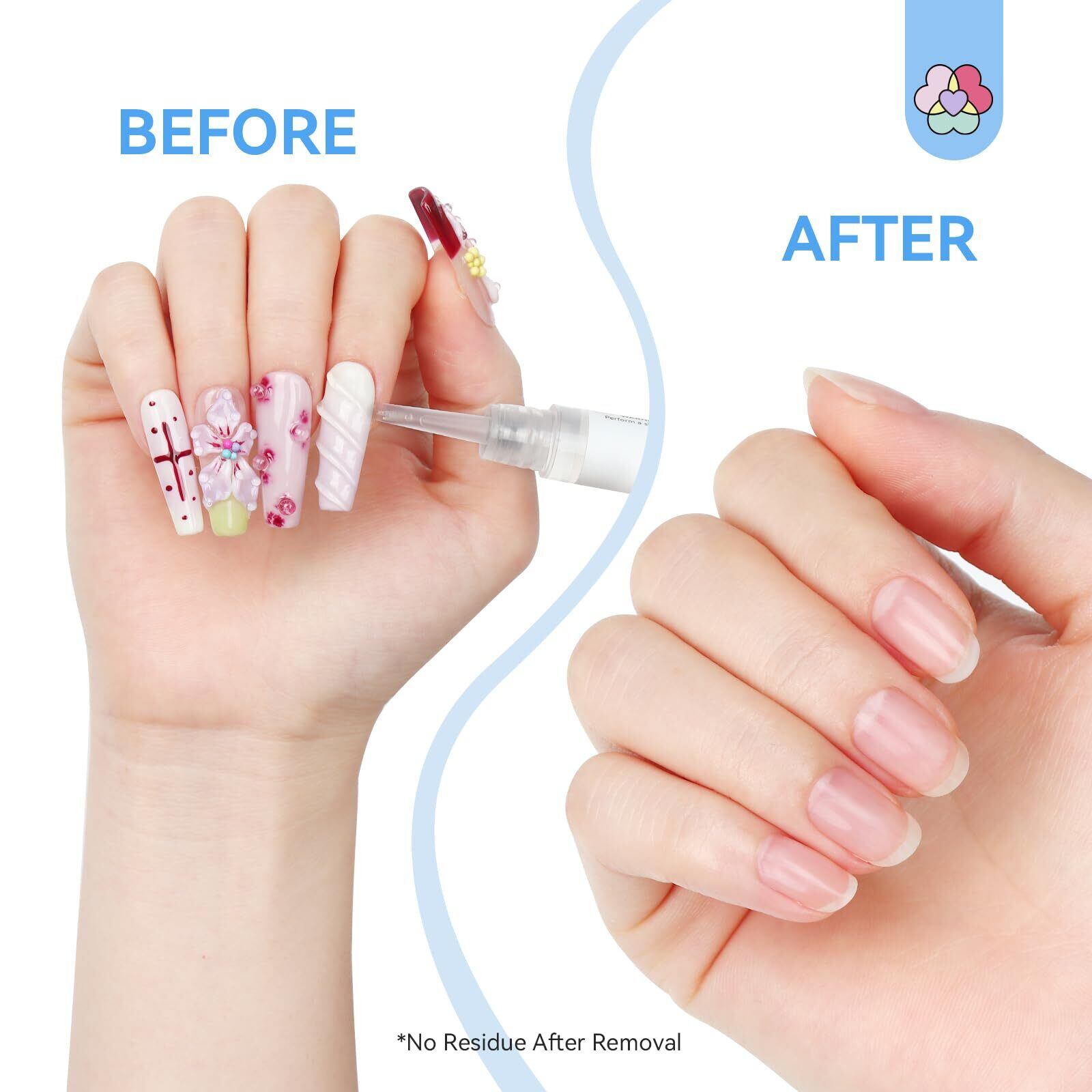 天然爪を傷つけません: ネイルグルーリムーバーペンは、アセトンやその他の有害成分を含まない健康的な処方が特徴です。剥がした後も残留物が残らず、天然の爪を傷つけたり、表面が白くなったりしません。