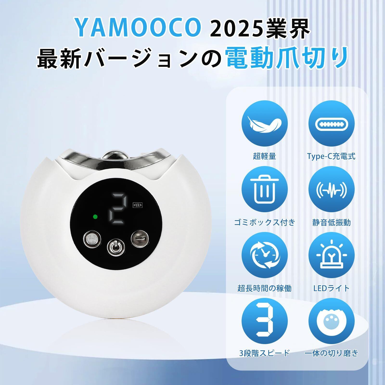 YAMOOCO 電動爪切り 爪削り爪磨き3段階スピード 【2025新型 両用爪切り爪研き】 LEDライト 低騒音 軽量 操作簡単 Type-C充電式 飛び散らない ゴミボックス付き ネイルケア 電動つめきり 持ち運びに便利 子供/大人/高齢者に向け ブラシ付き