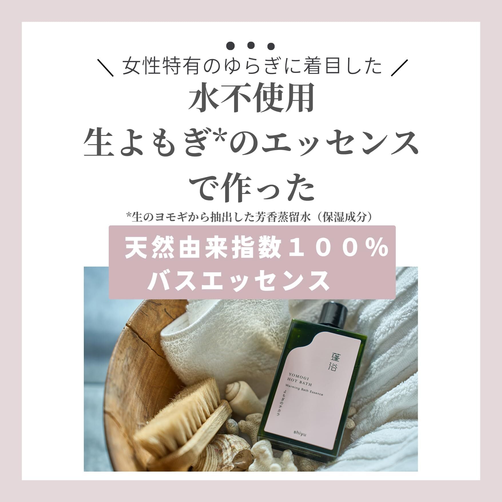 私を癒す温活ブランド「shiyu(シユ)」からギフトセットが登場!有機よもぎをたっぷり配合したよもぎバスエッセンスにお風呂でヒノキの香りを楽しめるヒノキボールを添えました。どんな時も寄り添いたいからあえてシュワシュワ感、色、香りもありません。シンプルだからこそ素材・製法にこだわりを。手軽にご自宅でヨモギ温活を。 長野県産ヨモギ(※1) × 2種の和漢植物エキス(※2) ※1 … ヨモギ葉水、ヨモギ葉エキス(全て保湿成分) ※2 … ウンシュルミカン果皮エキス、ツボクサエキス、ツルドクダミ根エキス(全て保湿成分)