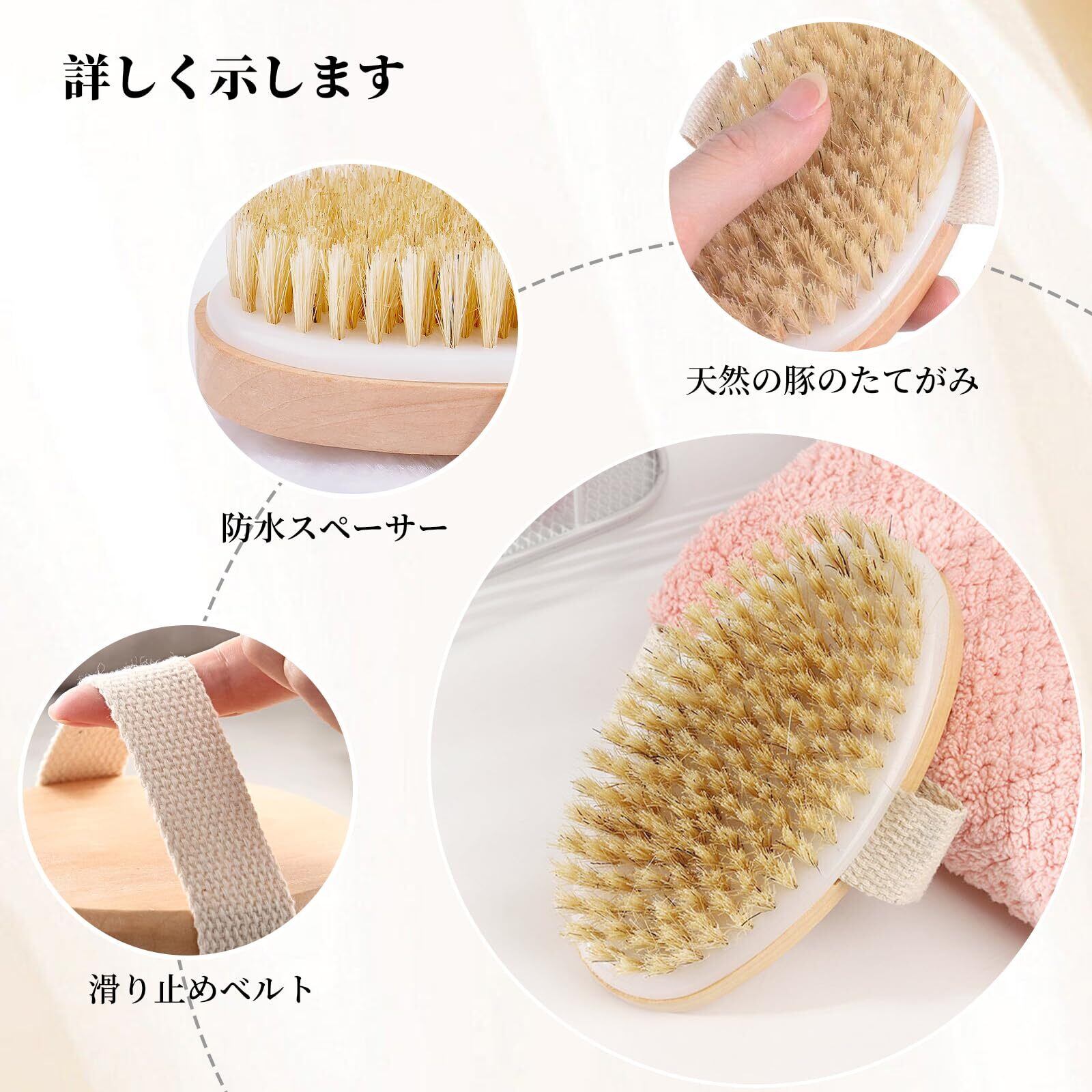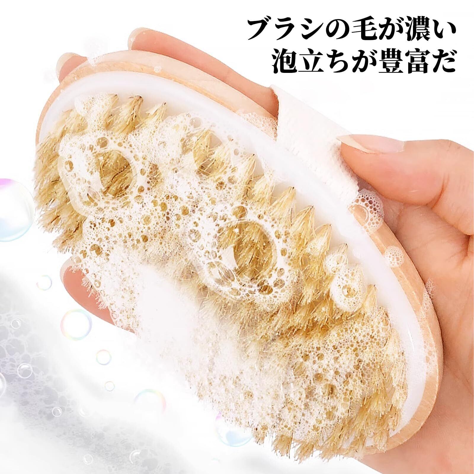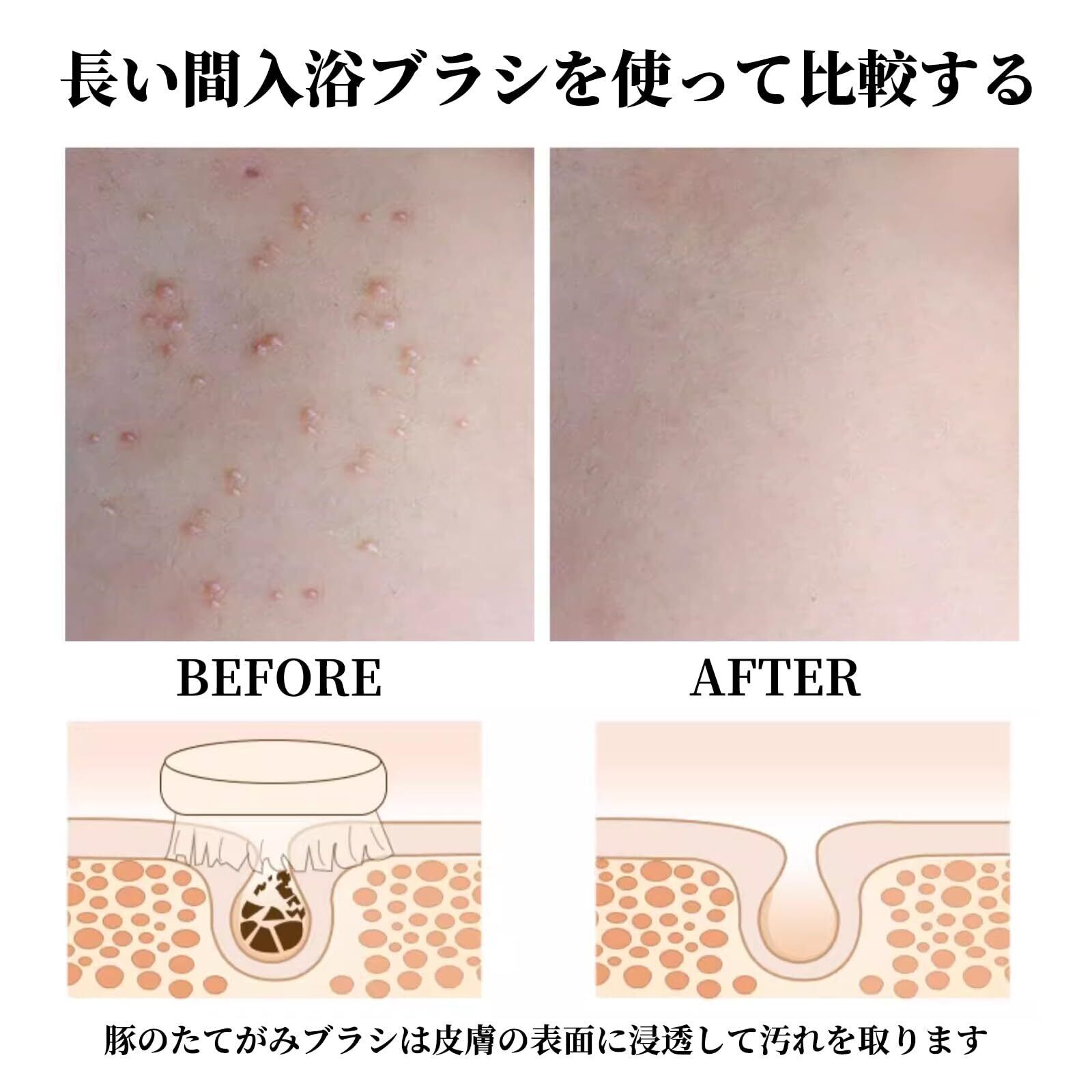 【ボディブラシ お風呂用】:ボディブラシは、ボディブラシを使うことで、背中の毛穴につまった汚れを取り除き、ニキビの改善を手助けしてくれます。ドライブラッシングを行えば、血行やリンパの流れが良くなったり、肌の角質除去、むくみの軽減、冷え性の改善などの効果が期待できます。