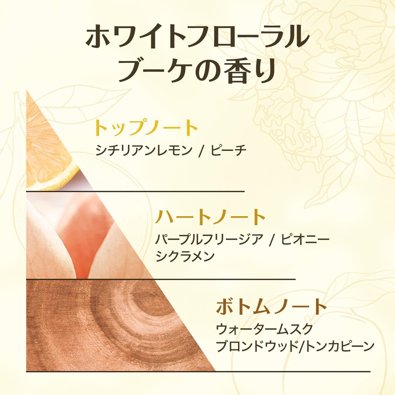 水、セテアリルアルコール、アモジメチコン、ベヘントリモニウムクロリド、セチルエステルズ、香料、イソプロパノール、トリデセス-6、フェノキシエタノール、マイカ、カラメル、セトリモニウムクロリド、グリセリン、酸化チタン、クロルヘキシジン2HCl、リモネン、酸化鉄、ラベンダー油、ハチミツエキス、アルギニン、オレアミドオクタデカンジオール、ヒポファエラムノイデス種子油、乳酸、黄4、ヒドロキシプロピルトリモニウム加水分解コムギタンパク、アセチルジペプチド-1セチル、赤504、クエン酸