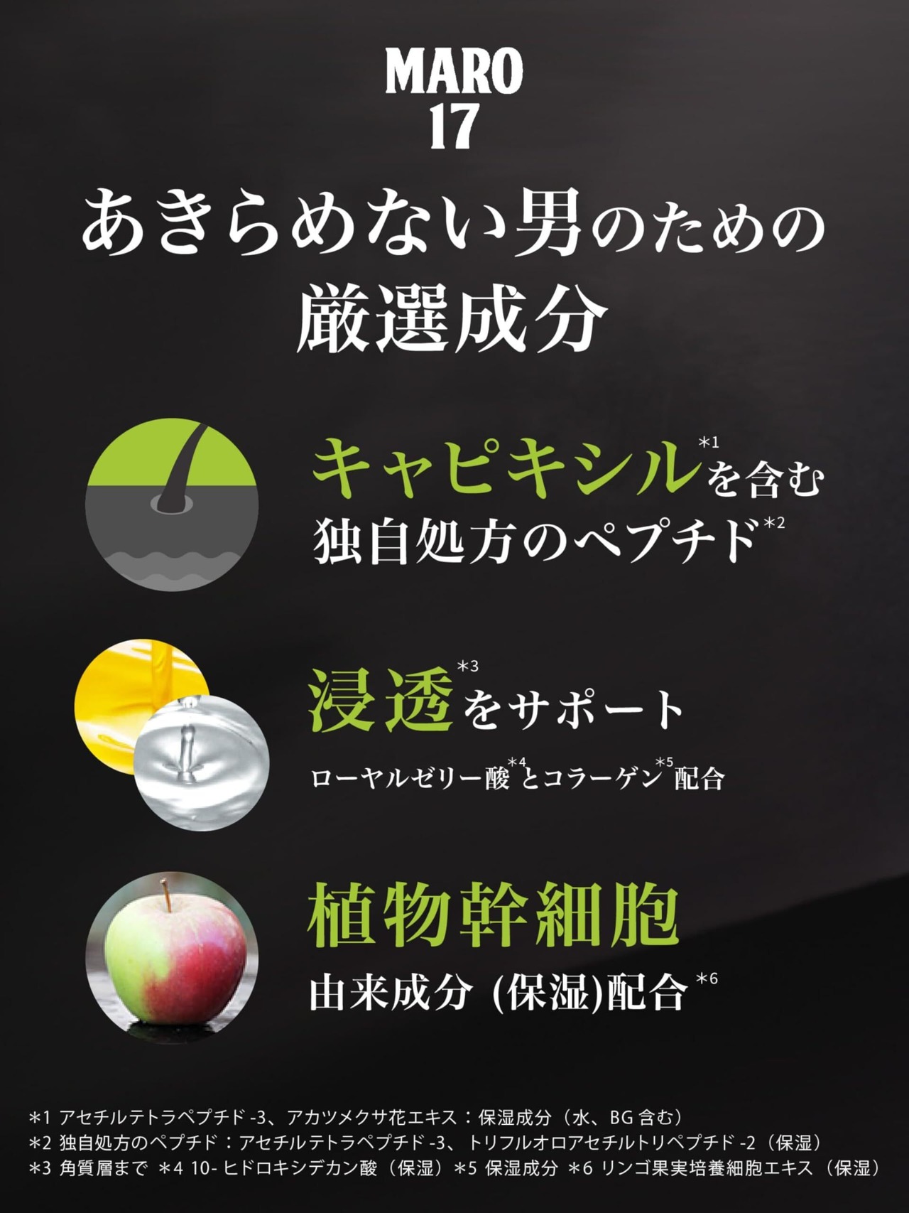 その頭皮に逆転劇を! MARO17独自処方のペプチド(*1)配合、男のためのプレミアムなシャンプー。頭皮のギトギト脂を徹底オフし、スッキリ洗い上げます。