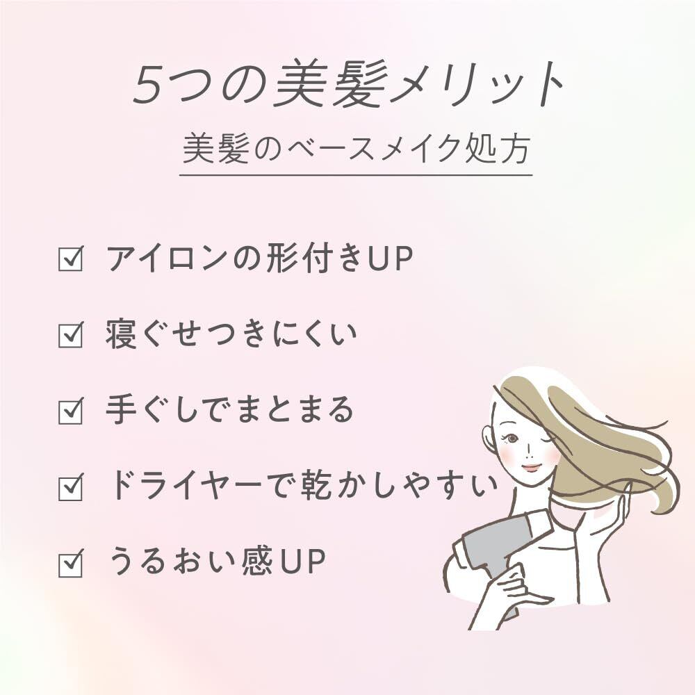 ■パサつきやダメージによる、からまりが気になる髪に ■美髪のベースメイク処方 ■毛流れ整えツヤ感・手触り 補整 ■感動のうるサラ髪へ ■髪の内部とキューティクルをW補修 ■11種のアミノ酸成分配合(補修) アルギニン、アスパラギン酸、グリシン、アラニン、セリン、バリン、イソロイシン、プロリン、トレオニン、ヒスチジン、フェニルアラニン + 天然由来の美髪オイル18-MEA OIL※1配合(毛髪保護)