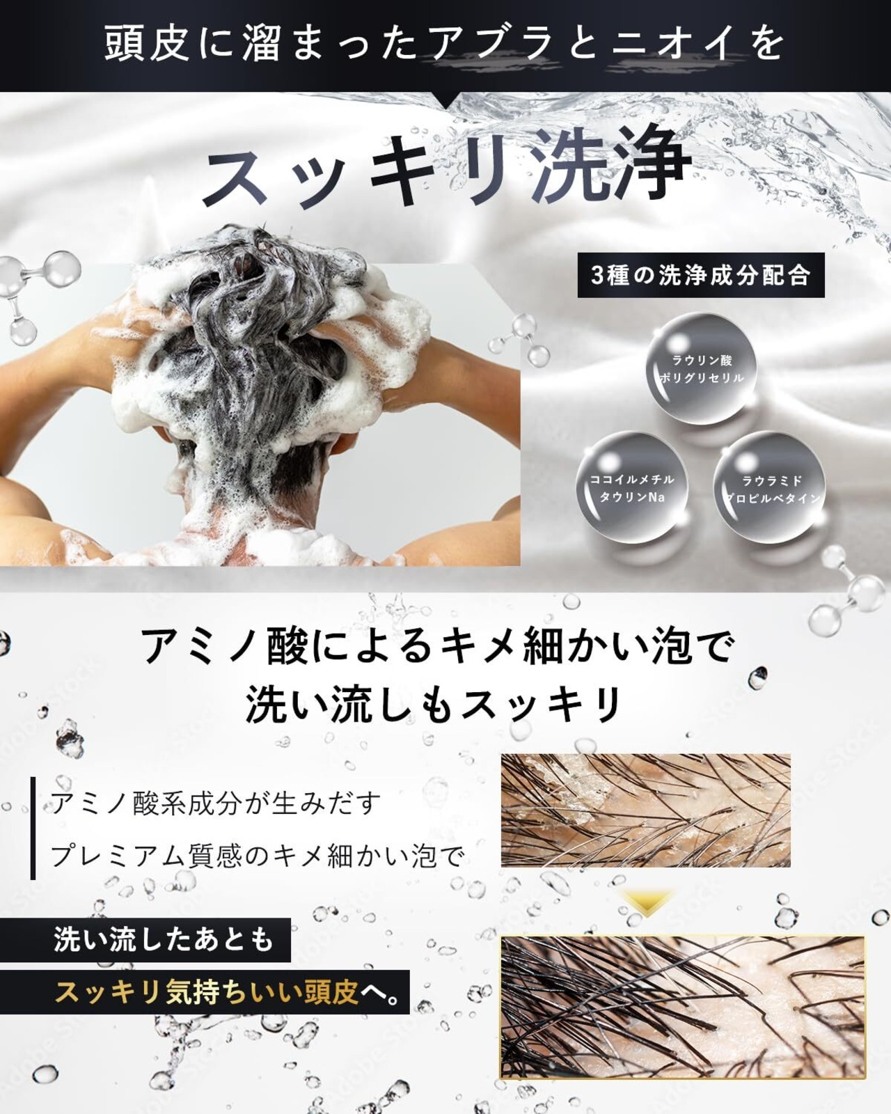 【アミノ酸洗浄剤を使用】アミノ酸系シャンプーは頭皮に優しく保湿力が特徴的です。(ラウラミドプロビルベタイン:しっとりサラサラ・ココイルメチルタウリンNa:さっぱり)また毛髪に艶を与えしなやかな髪に導きます。頭皮に優しいにも関わらずしっかりと汚れを洗浄出来ます。