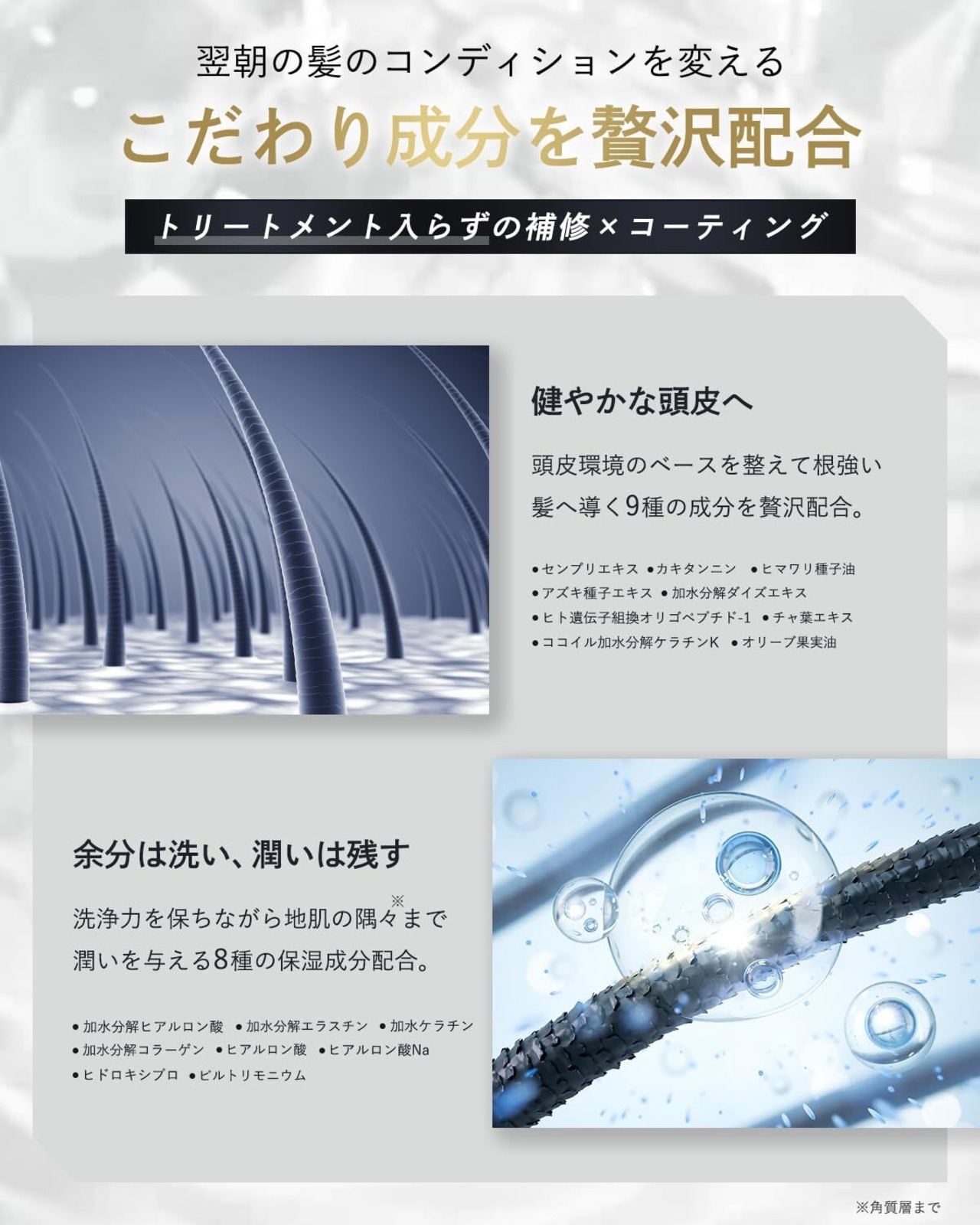 【面倒なトリートメントいらず、これ1本で完結】毛髪内部から潤いを与えてくれる「加水ケラチン」と「加水分解コラーゲン」を配合※1。また、低分子化により「ヒアルロン酸Na」「ヒアルロン酸」「ヒドロキシプロ」「ピルトリモオニウム」などの成分を肌の奥(角質層まで)まで浸透することで洗浄しても皮膚や毛髪に残り潤いを保ちます。※1:保湿成分