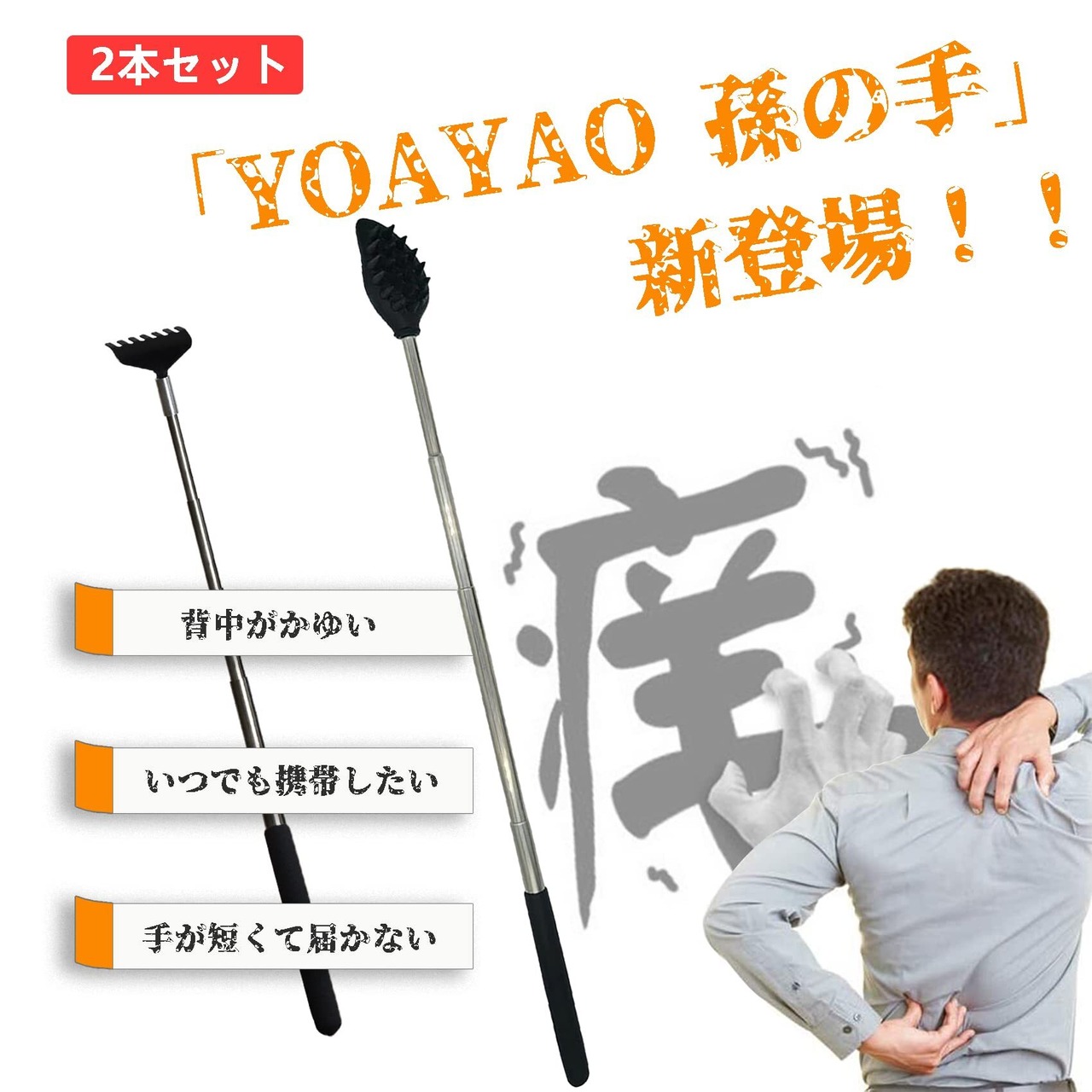 【最長67cm!痒い所に手が届く!】畳めば持ち運びも便利な「YOAYAO 孫の手 2本セット」が登場! 5段階の伸縮で67cmまで伸長しかゆい背中の奥まで届きます。収縮時は約20cmと手のひらサイズに。痒い時、手が届かない場所も、これがあればラクラク。届きそうで届かなかったもどかしさが一気に解消!