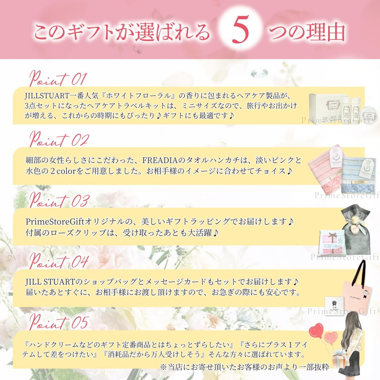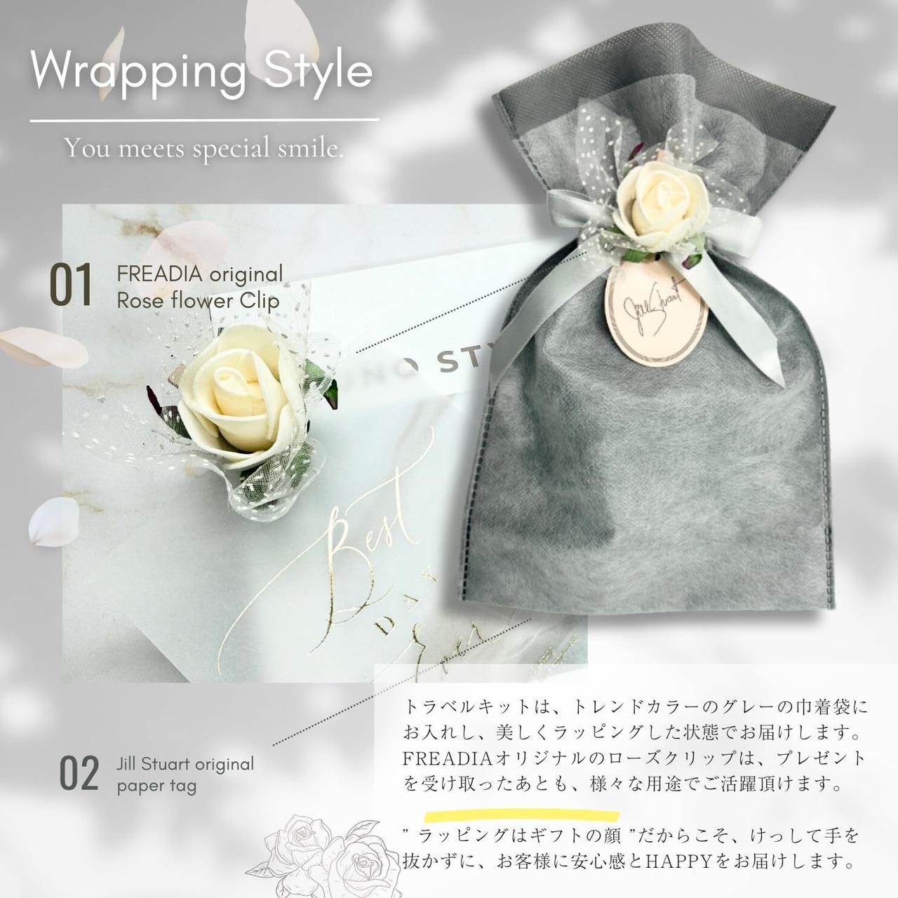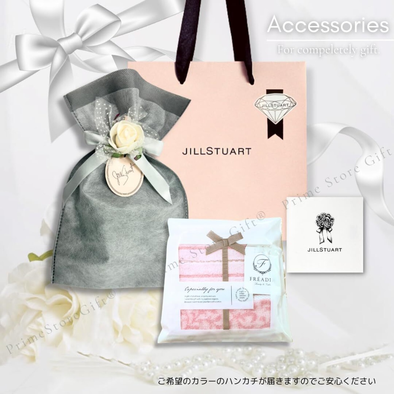 ️【当ギフトセットについて】JILLSTUART一番人気『ホワイトフローラル』の香りに包まれるヘアケア製品が 3点セットになったヘアケアトラベルキット、FREADIAの大人可愛いハンカチをセットにし、エレガントなラッピングで仕上げたギフトセットです