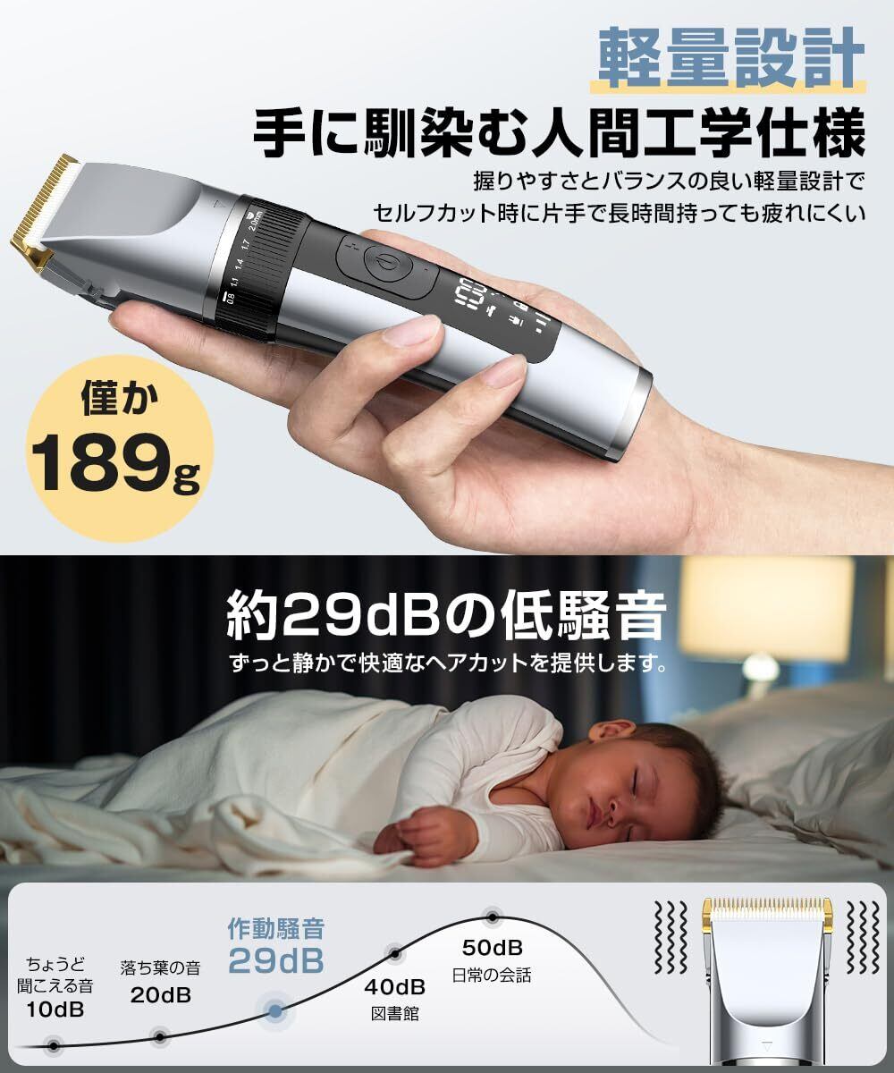 【自動研磨機能・軽量設計】この バリカン は、自動研磨機能により刃を常に最適な状態に保ちます。軽量でわずか189gの人間工学に基づいた設計で、長時間の使用でも疲れにくく、快適に使用できます。家庭用だけでなく、プロフェッショナルにも満足いただける品質です。