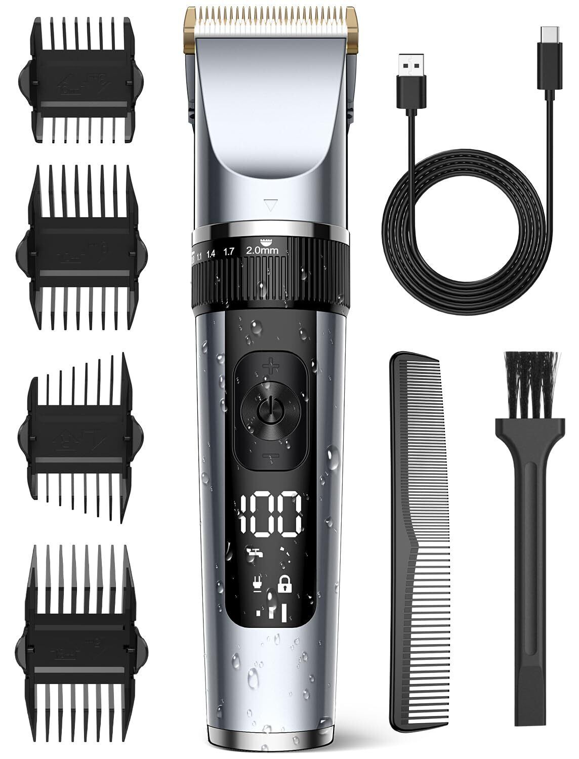 【2024新 発売・日本製刃】 バリカン メンズ 防水 usb-c 充電式 コードレス 8種類ガイドコーム 3段階スピード/5段階刈り高さ調節 低騒音 電動バリカン 髪 散髪用 ヘアカッター 'バリカン 大型LED液晶 水洗い可 安全ロック機能 IPX7 防水 軽量 セルフカット ツーブロック 坊主 大人 子供 家庭用 コンパクト 日本語説明書 (シルバー)