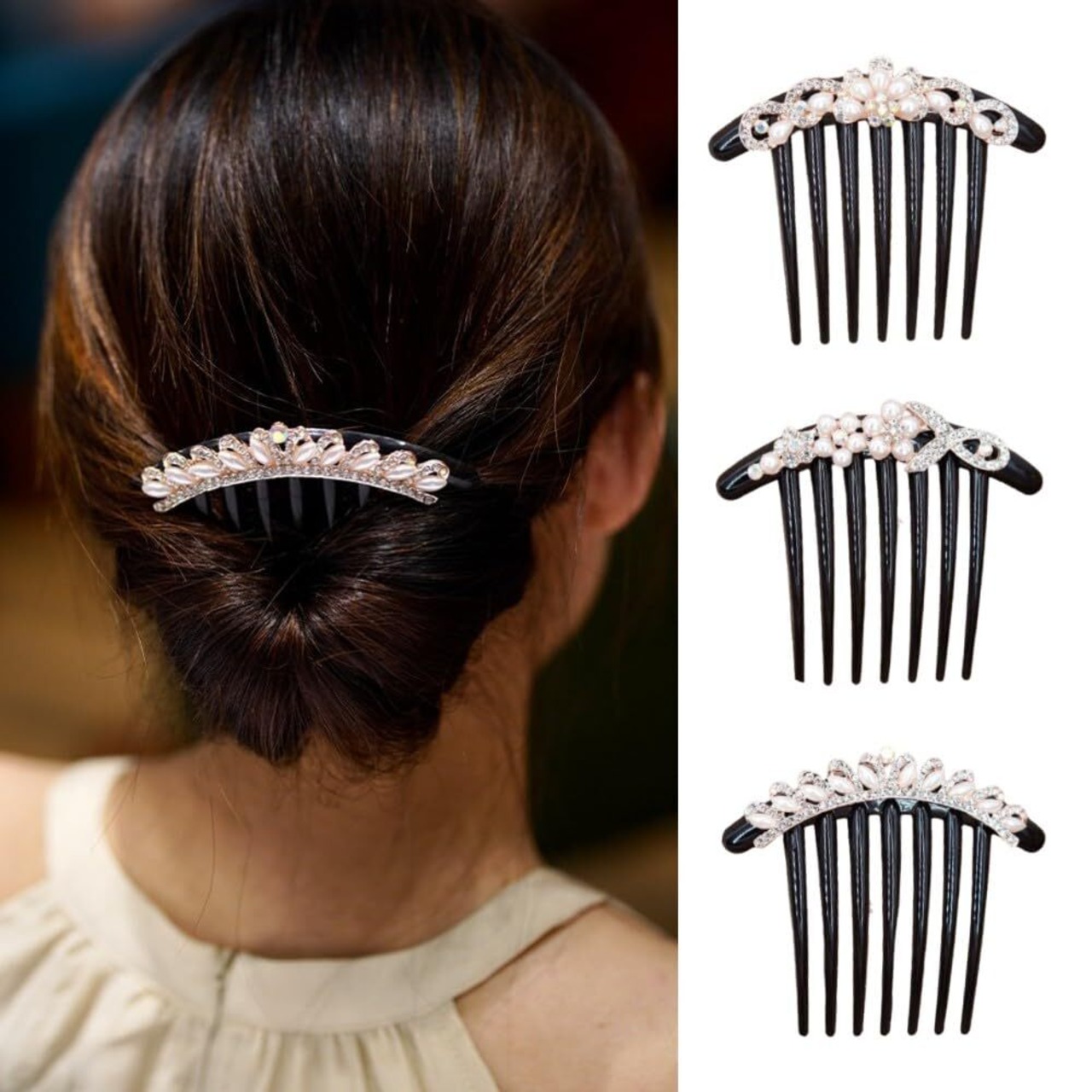 【夜会巻きコーム】:美しいパールとラインストーンが散りばめられた夜会巻きコームは、おしゃれで優雅な雰囲気があります。どんな髪型でも、サッと結び込むだけで上品なヘアスタイルに変身し、普段の装いにちょっとした華やぎを添えることができます。