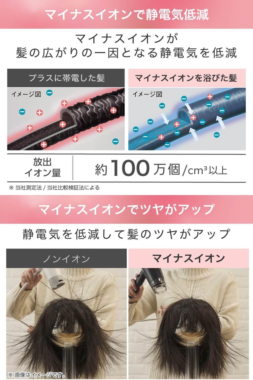 吹出口の2ヶ所からマイナスイオンを発生させ、風に乗せて放出することで、マイナスイオンを髪の根元までしっかり行き渡らせます。髪の広がりの一因である静電気を低減し、髪のツヤもアップします。※イメージ図