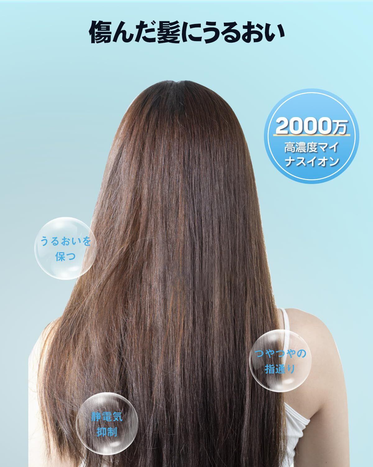 【2000万高濃度マイナスイオン噴射】髪にやさしいマイナスイオンを発生。髪をいたわりながら乾かします。髪の毛がしっとりと潤い、静電気の発生を抑えてくれるので、パサつきや切れ毛、髪の広がりで悩んでいる方におすすめです。