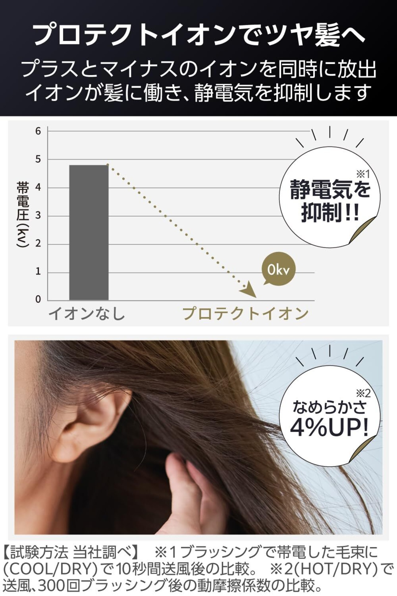 乾燥や髪摩擦による静電気の発生が、大風量ドライヤーの課題。テスコム独自のプロテクトイオンが大風量ドライヤーの課題を解決し、ワンランク上の美髪に導きます。