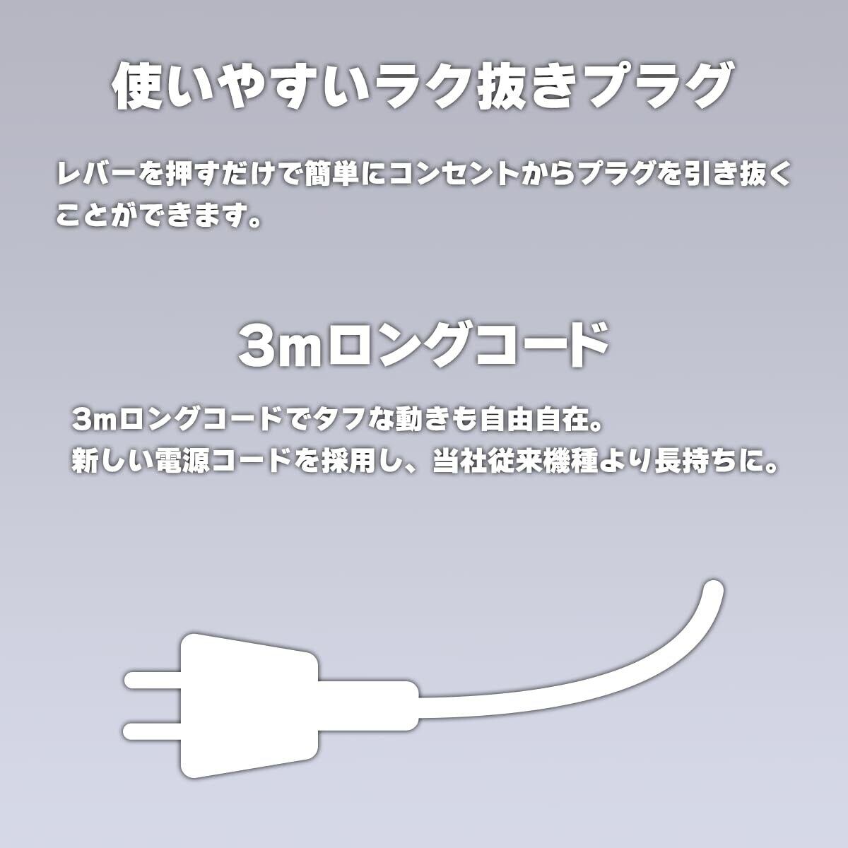 ● 掃除時間まで効率化できる、高性能フィルター採用 メンテナンスの事まで考えて、丈夫で掃除しやすい設計に。 ● ドライヤーに最適化された自社設計モーター採用 。● サロンワークに便利な3mロングコード 。● ラク抜きプラグで取り外し簡単。