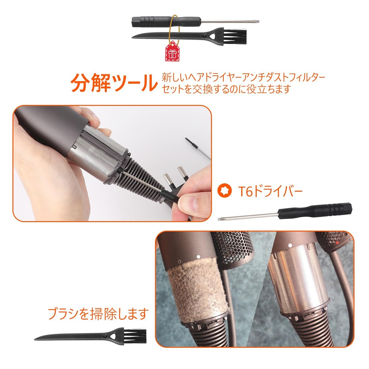 [パッケージ一覧] ヘアードライヤーアウターフィルター* 1; インナーフィルター* 1; T6ドライバー* 1、ダストブラシ* 1。ヘアードライヤー内部のフィルターの取り外しと取り付けのためのギフトドライバー。マグネット式の外側フィルターはいつでも取り外して掃除できますが、内蔵フィルターは頻繁に取り外すのは簡単ではないので、無料の掃除ブラシで表面のホコリを払い落としてください。