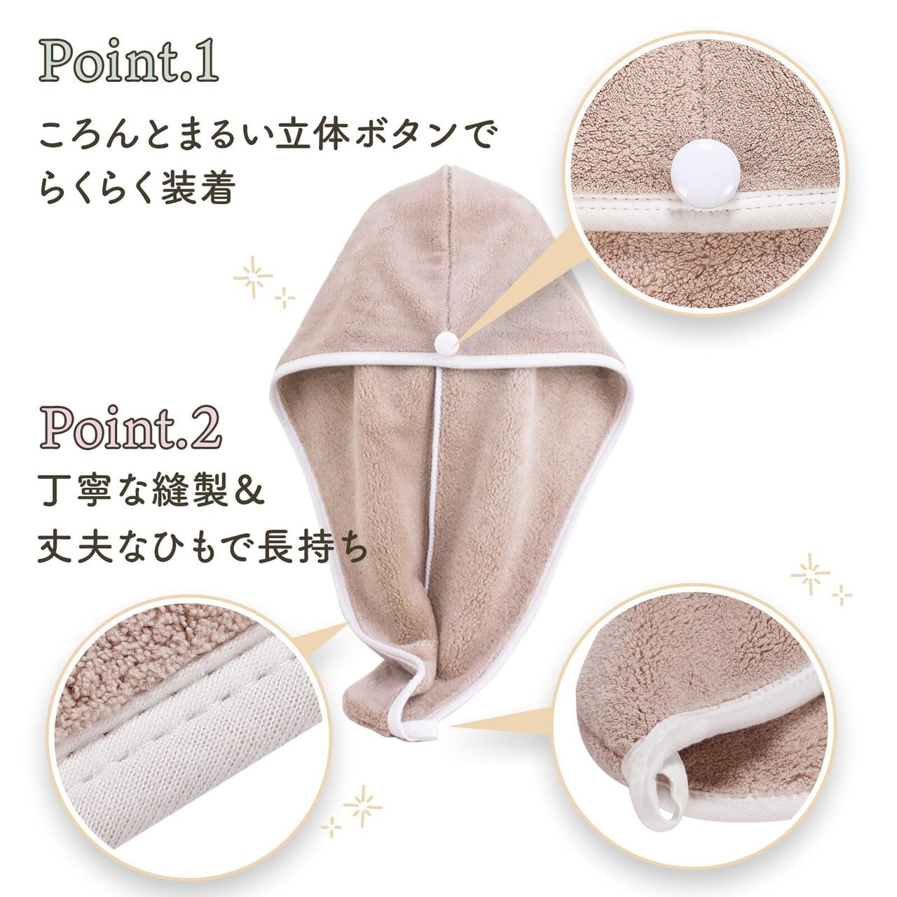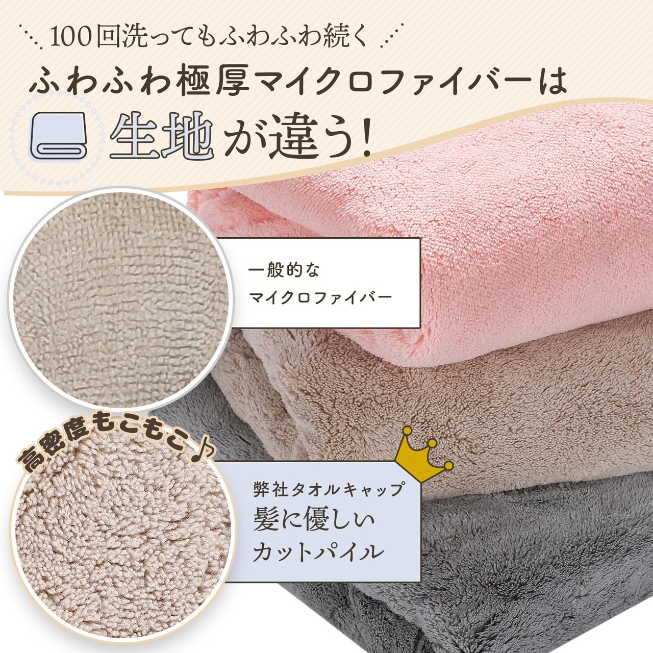 【吸水力バツグン、ふわふわのタオルキャップ】RALQのタオルキャップは高品質な極厚マイクロファイバー素材で、吸水力バツグンです。タオルキャップの吸水量は従来タオルにより5倍以上です。カットパイルのふわふわ生地がお肌や髪を優しく包みます。