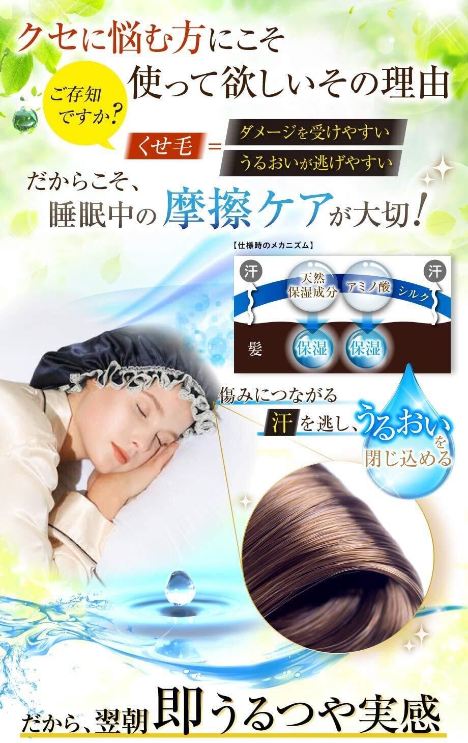 【特徴】シルクは通気性と保温性に優れ、夏は涼しく、冬は温かい素材でオールシーズン着用頂くことができます。就寝時にかぶることで 摩擦 乾燥 静電気 から守ることはもちろん、シルクアミノ酸の保湿作用によって、寝ている間に傷んだ髪を集中保湿。翌朝 艶やか で 潤い のある、うるツヤ髪を即実感。 傷んだ髪に起こりがちな 枝毛 切れ毛 うねり ひろがり も出にくく1日中手ぐしでまとまる自分本来の髪へ。