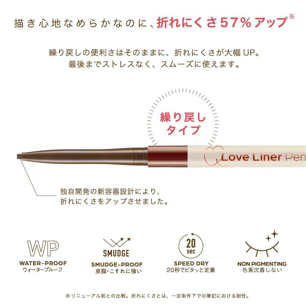 ラブ・ライナー史上最細、1.1mm楕円芯は超極細ラインから、太めまで自由自在。さらに、にじみにくさや折れにくさ、とろけるような描き心地も進化しました。 どんなラインも、するっとキワまで美しく。カワイイ、キワまる。 アイライナーなのに、美容液成分15種配合。目元にうれしい美容液成分をさらにプラスし15種類に。いつものメイクをしながら、目元ケアもかなえます。