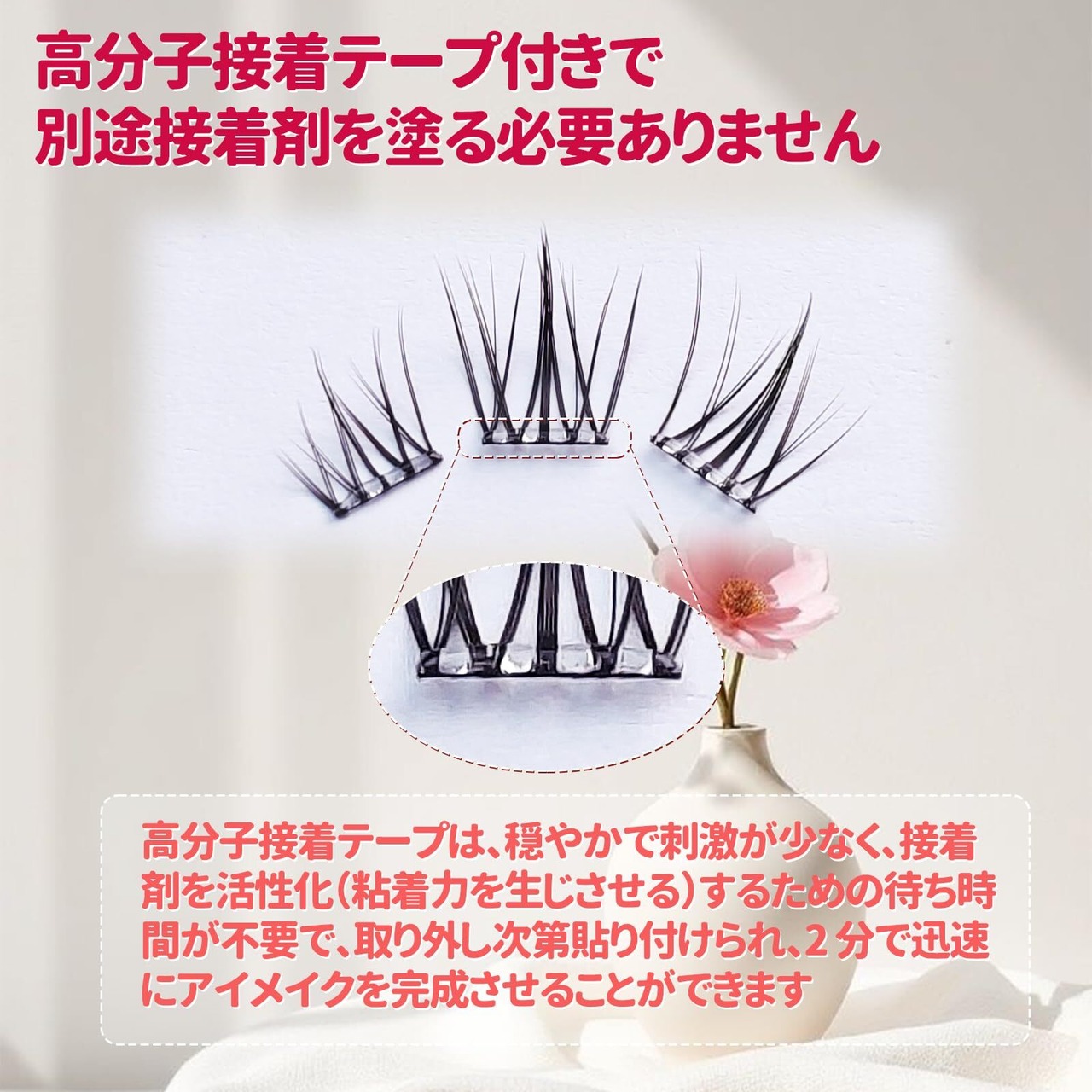 接着剤不要設計:付属の接着テープがあり、接着剤を活性化する必要がありません。貼るのが簡単で、外すときも化粧落としを使わず、マツゲの先端を軽く引くだけで外せます。