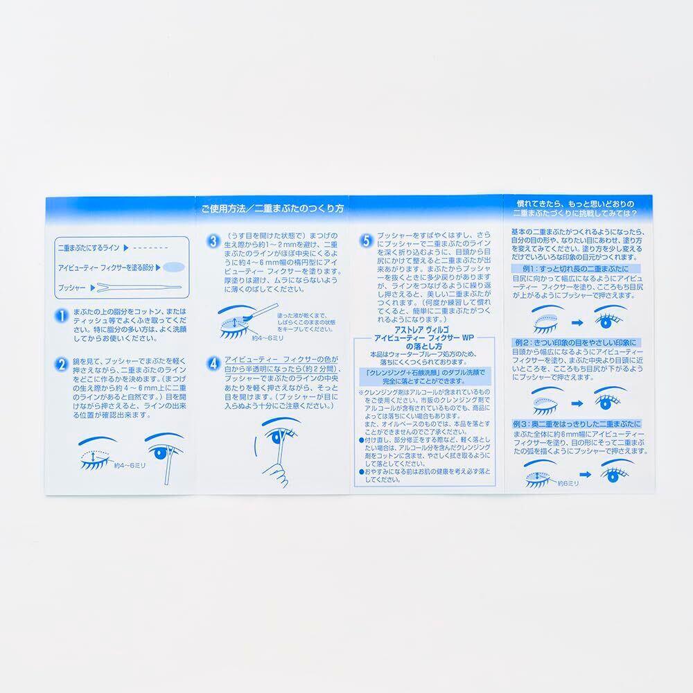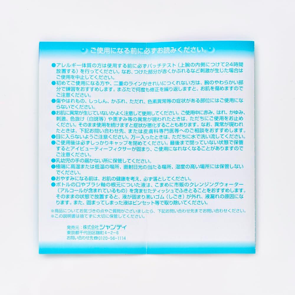 ※アレルギー体質の方はご使用前に必ずパッチテストを行って下さい。なお、つけた部分が赤くかぶれるなど刺激が生じた場合はご使用を中止して下さい。※初めてご使用になる方は、二重のラインがきれいにつくれない方は、腕のやわらかい部分で練習をおすすめします。まぶたで何度も修正を繰り返しますとお肌を傷めますのでご注意ください。※傷やはれもの、しっしん、かぶれ、ただれ、色素異常等の症状がある部位にはご使用にならないで下さい。また、ご使用中に赤み、はれ、かゆみ、刺激等の異常が現れたときには、直ちにご使用をおやめ下さい。そのままご使用を続けますと症状が悪化することもあります。※目に入らないようご注意下さい、万一入った場合は直ちに水で洗い流して下さい。※ご使用後は必ずしっかりキャップを閉めて下さい。最後まで閉まっていない状態で保管するとグルーが固まり、ご使用になれなくなることがありますのでご注意下さい※お子様の手の届かない所に保管して下さい。※極端に高温または低温の場所、直射日光の当たる場所、湿度の高い場所には保管しないで下さい。※お肌の健康を保つため、おやすみになる前には必ず落としてください。※ボトルの口やブラシ軸の根元に付いた液は、こまめに市販のクレンジングウォーター(アルコールがふくまれているもの)を含ませたティッシュでふきとることをおすすめします。そのままの状態で放置すると、液が固まり黒いゴム(しごき)が外れ、液漏れの原因になります。また、固まってしまった液はピンセット等で取り除いて下さい。
