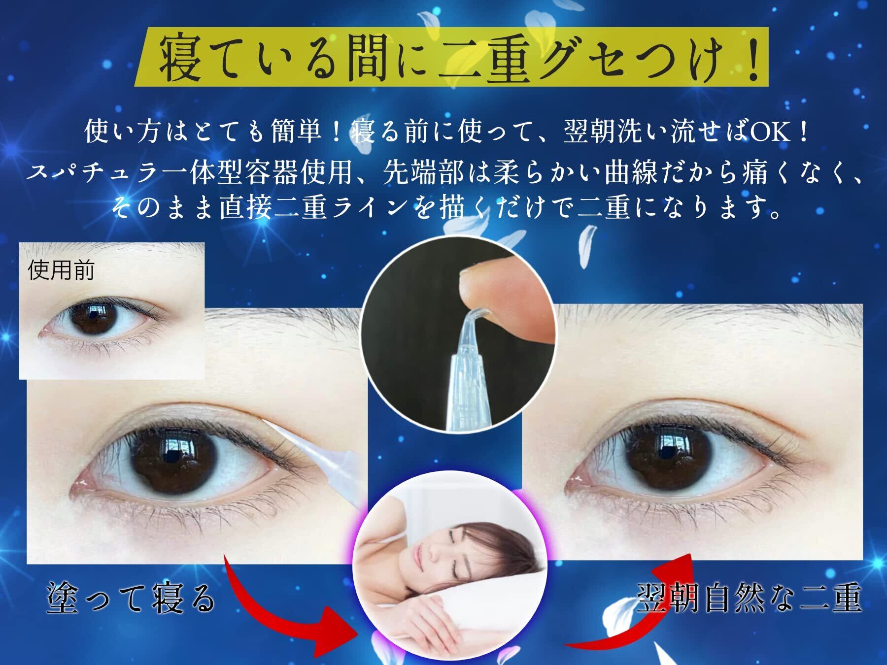 夜用なので保湿成分(ヒアルロン酸Na、セラミドAP、セラミドNP)を贅沢に配合。寝ている間に二重の線を作りながら保湿も出来て一石二鳥。